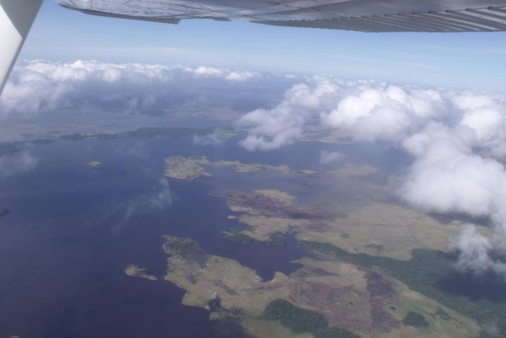 Stareńki samolocik. Najpierw załadowaliśmy bagaże. Później pilot otaksował nas wzrokiem i porozsadzał na miejscach. Ja trafiłem na miejsce drugiego pilota, z przodu, po prawej ręce lotnika. Musiałem podkurczyć nogi i schować kolana, aby niechcący nie dotykać różnych wystających dźwigienek i przycisków. Pani Ela trafiła do drugiego rzędu wraz z Brazylijczykiem.