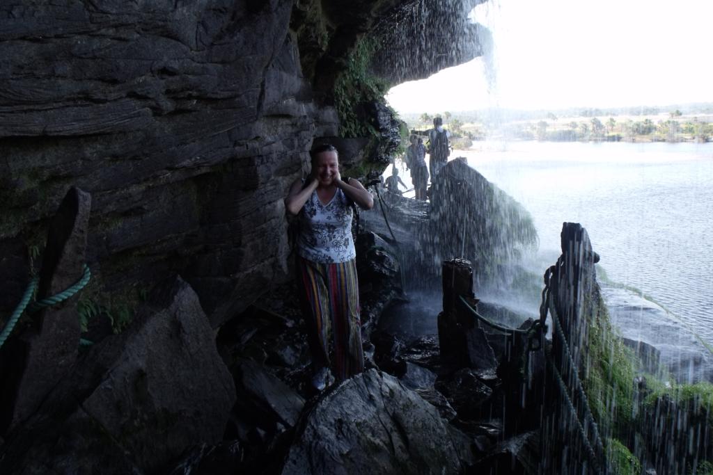 Po plażowaniu idziemy na zwiedzanie okolicy. Przechodzimy pod wodospadem, w tle którego używałem kąpieli. Woda leje się kaskadą i moczy od góry do dołu. Nie ma szansy aby tego uniknąć. Ale jest przyjemnie, bo temperatura powietrza oscyluje w okolicach 30 stopni. Wieje lekki wiaterek, a mokre ciuchy przyjemnie chłodzą ciało.