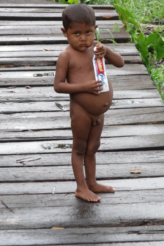 na ziemię najeżoną ostrymi pozostałościami po drzewach, aby przeżyło. Jeżeli nie od razu, to trochę później. Dzieci indiańskie są zupełnie inne niż nasze. Kiedy na wycieczce Rio Caura płynęła z nami żona Samuela z dzieckiem, nie słyszałem, aby chociaż raz zapłakało. Tutaj również – uśmiechnięte i radosne. Nie narzucające się, ale bardzo wdzięczne za każde zainteresowanie się nimi. Lubią pozować do fotek i oglądać swoje zdjęcie...