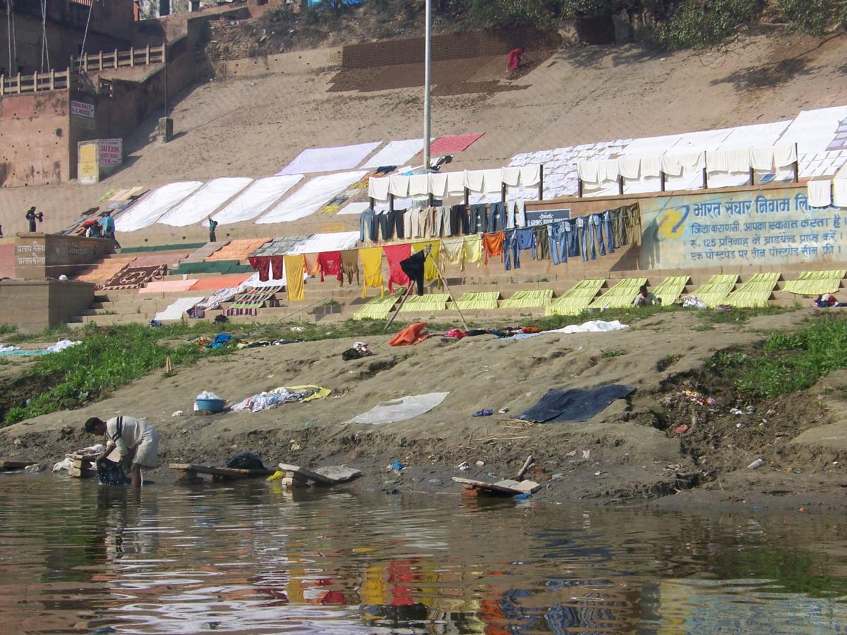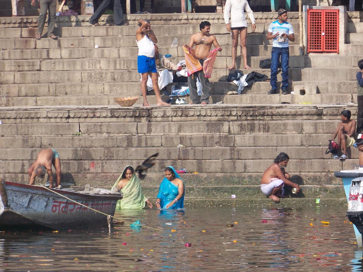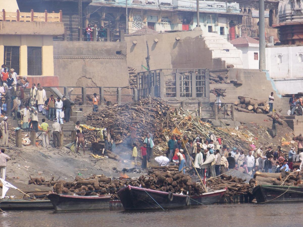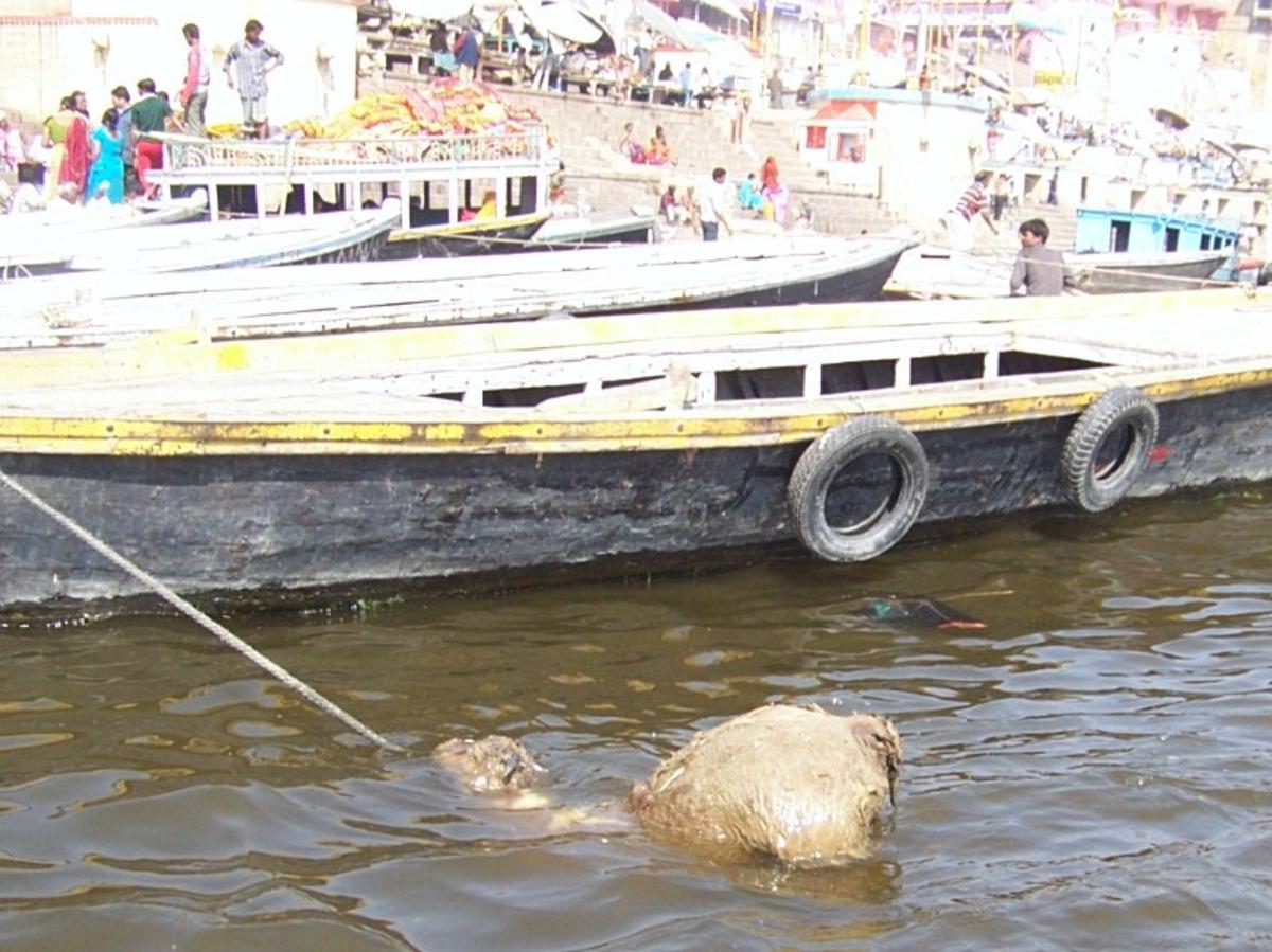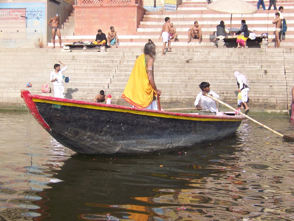 Opuszczamy pokój, zostawiamy plecaki przed recepcją, a sami na ostatni spacerek po Varanasi... Połaziliśmy troszkę po uliczkach i wylądowaliśmy nad Gangesem. Mamy dużo czasu, więc bierzemy łódkę na dwie godziny. Płyniemy... Jeszcze raz oglądamy panoramę miasta (podobno najstarszego na Świecie) płynąc w górę rzeki. Po powierzchni wody pływają różne śmieci. Wypatrzyłem nawet prezerwatywę - widać zabawa była przednia!!!