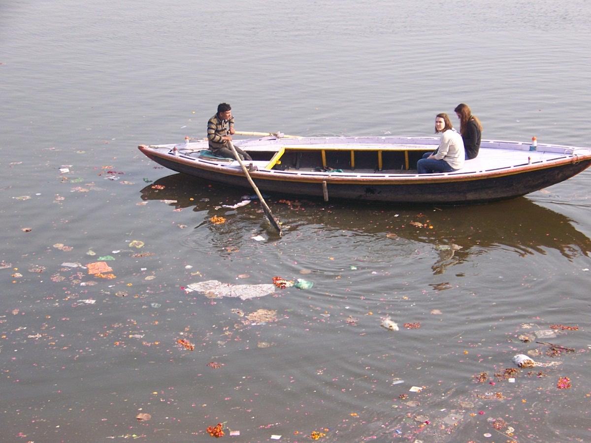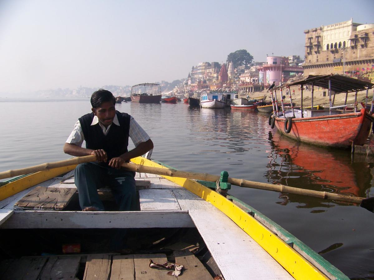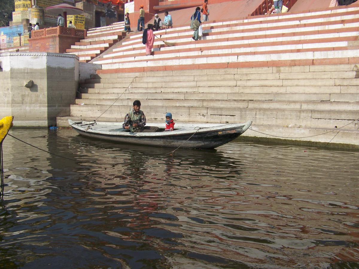 Po śniadaniu idziemy (we dwoje) na brzeg rzeki i bierzemy łódkę na godzinę (po 50 rupii od osoby). Płyniemy w górę rzeki oglądając panoramę zabudowanego brzegu.