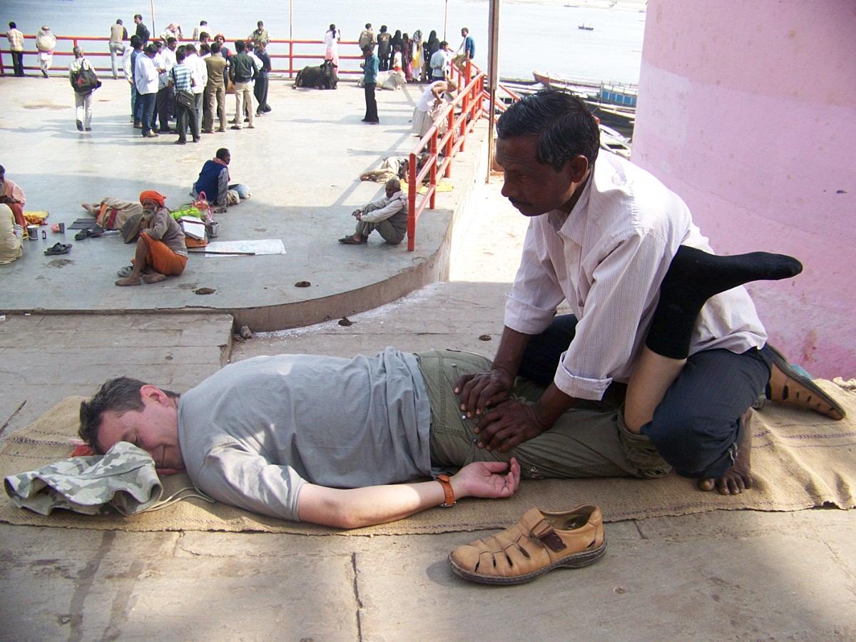 Kiedy wyszliśmy na brzeg, idąc w stronę hotelu, dorwał mnie masażysta. Oferował masaż barków za 10 rupii. Skończyło się na całościówce za 100. Ale było warto.