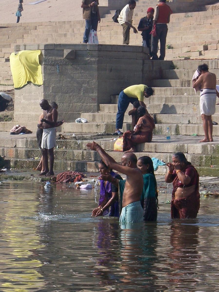 Idziemy tunelem przechodzącym pod domami i prowadzącym do ghatu. Ciemnawo, oświetlenia tam nie ma, bo i po co, jeżeli się tylko przechodzi, a mieszkańcom niepotrzebne. Tunel jest w miarę czysty tylko czuć, jak wszędzie, intensywną woń moczu. Taka publiczna toaleta... Mijamy jednego żebraka. Stary siwawy z długimi włosami, ubrany w jakieś łachy. Nie zadaję sobie trudu aby mu się przyjrzeć. Pełno tu takich.