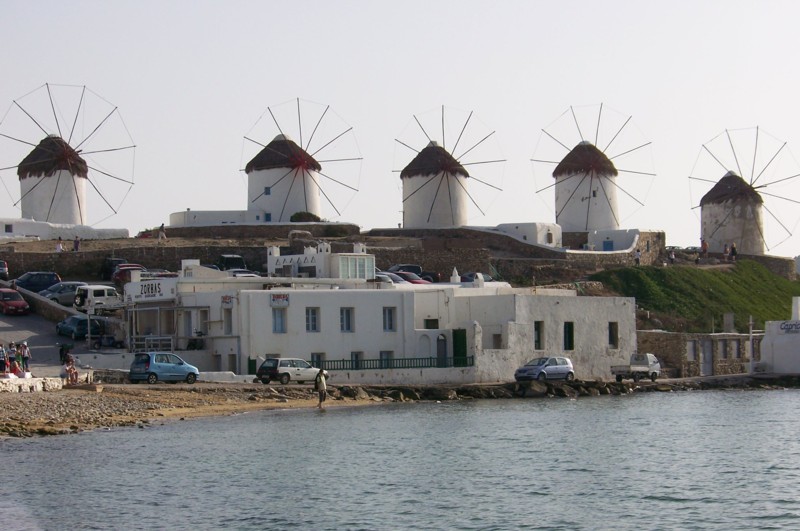 Dowiadujemy się, że prom będzie ale trochę (czyli około godziny) się opóźni z wypłynięciem, nawet powiedziano nam nazwiska załogi. Kiedy prom przypływa z godzinnym opóźnieniem, jestem już kolejnym członkiem tej barwnej grupy turystów w różnym wieku i wielu narodowości. Wszyscy płyniemy na Mykonos chociaż nasze cele są różne.Moim celem jest wyspa Delos którą najlepiej jest właśnie zwiedzać z Mykonos, natomiast celem moich współtowarzyszy jest sama wyspa a właściwie to jej dyskoteki i kluby nocne.