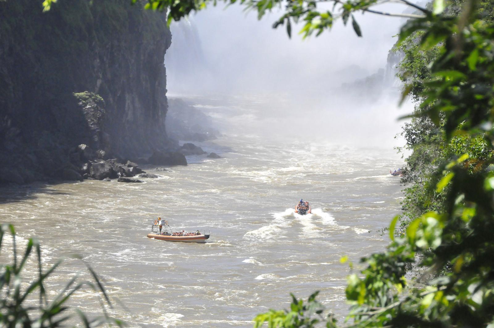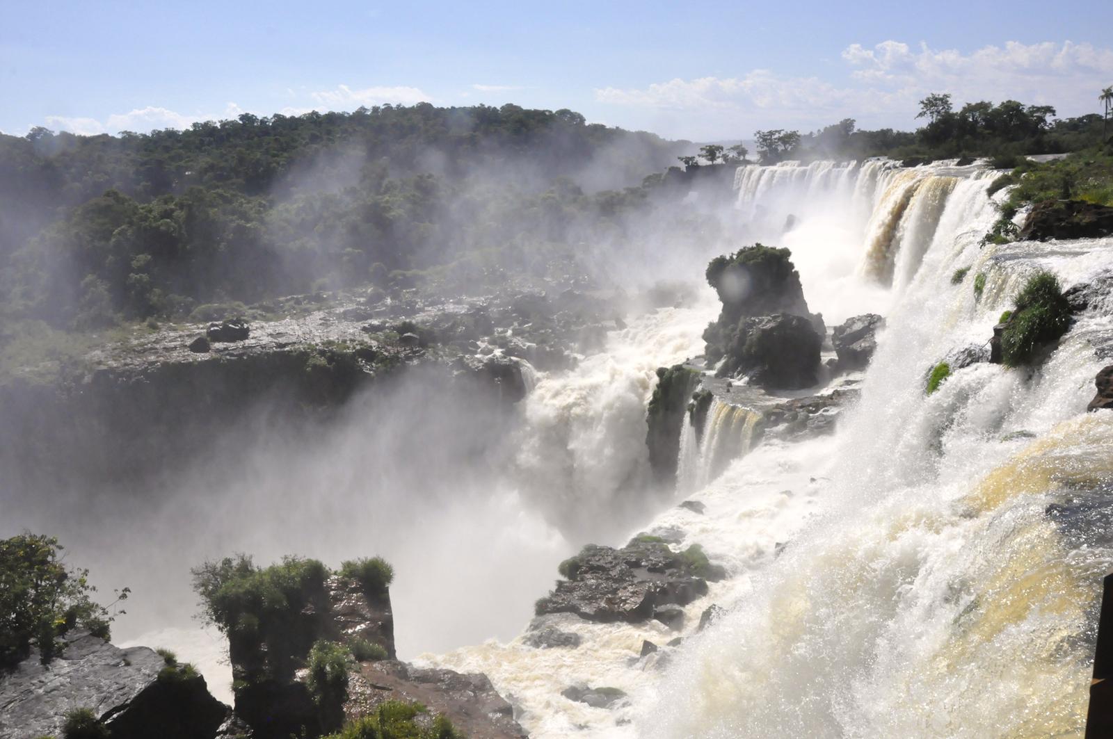 Chodzimy przez kilka godzin, ciesząc się jak dzieci bajkowymi widokami. Na koniec dochodzimy do stacji kolejki, która ma nas zawieźć do „Garganta del Diablo”, odczekujemy swoje w ostrym upale, po czym kolejką jedziemy na górę do początku szlaku. Przejście do wodospadów, poprowadzone jest systemem pomostów, przerzuconych nad dwiema rzekami, które wspólnie tworzą wodospady. Po drodze zatrzymujemy się, aby zobaczyć wielkie sumy, które karmione są przez turystów. Pomost przy gardzieli diabła zapchany jest ludźmi, a dodatkowo oblewany strumieniami wody, która unosi się nad wodospadami i pchana jest podmuchami wiatru. Widok jedyny w swoim rodzaju, możliwy do sfotografowania chyba tylko z góry. „Gardziel diabła” to ogromna zlewnia wielu wodospadów tworzących półkole w kształcie okrągłego basenu. Nieprawdopodobna jest ilość spływającej wody, która dodatkowo podświetlona jest zachodzącym słońcem. Sycimy wzrok, bo wiemy, że pewnie tu więcej nie przyjedziemy.