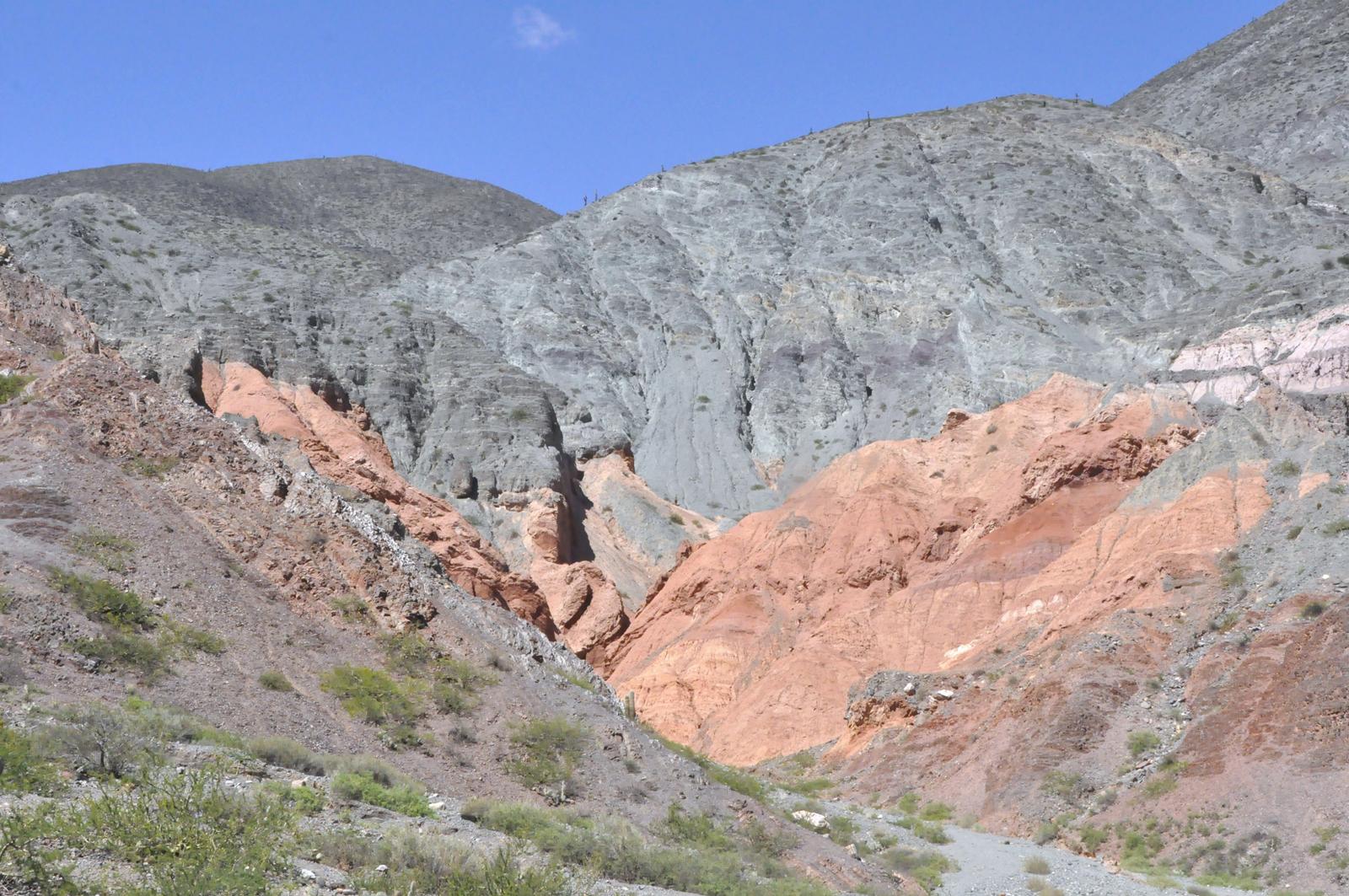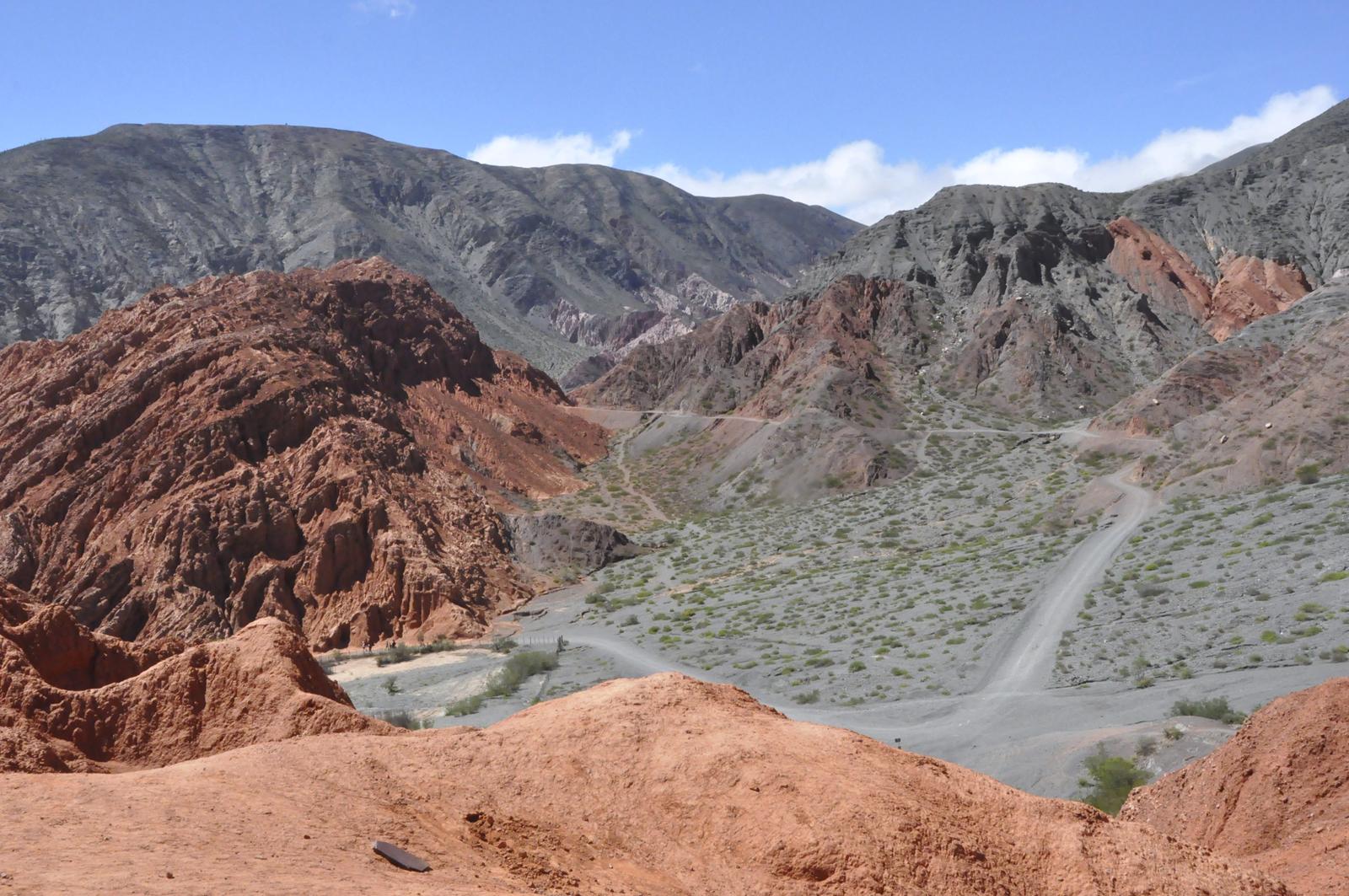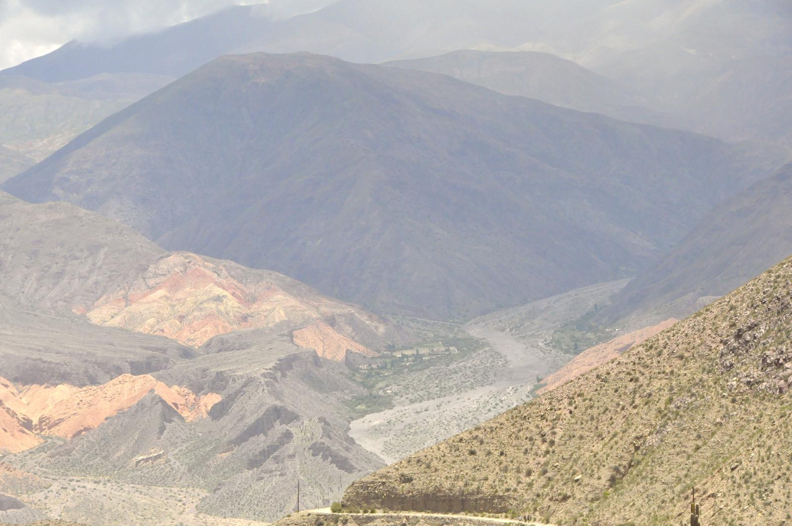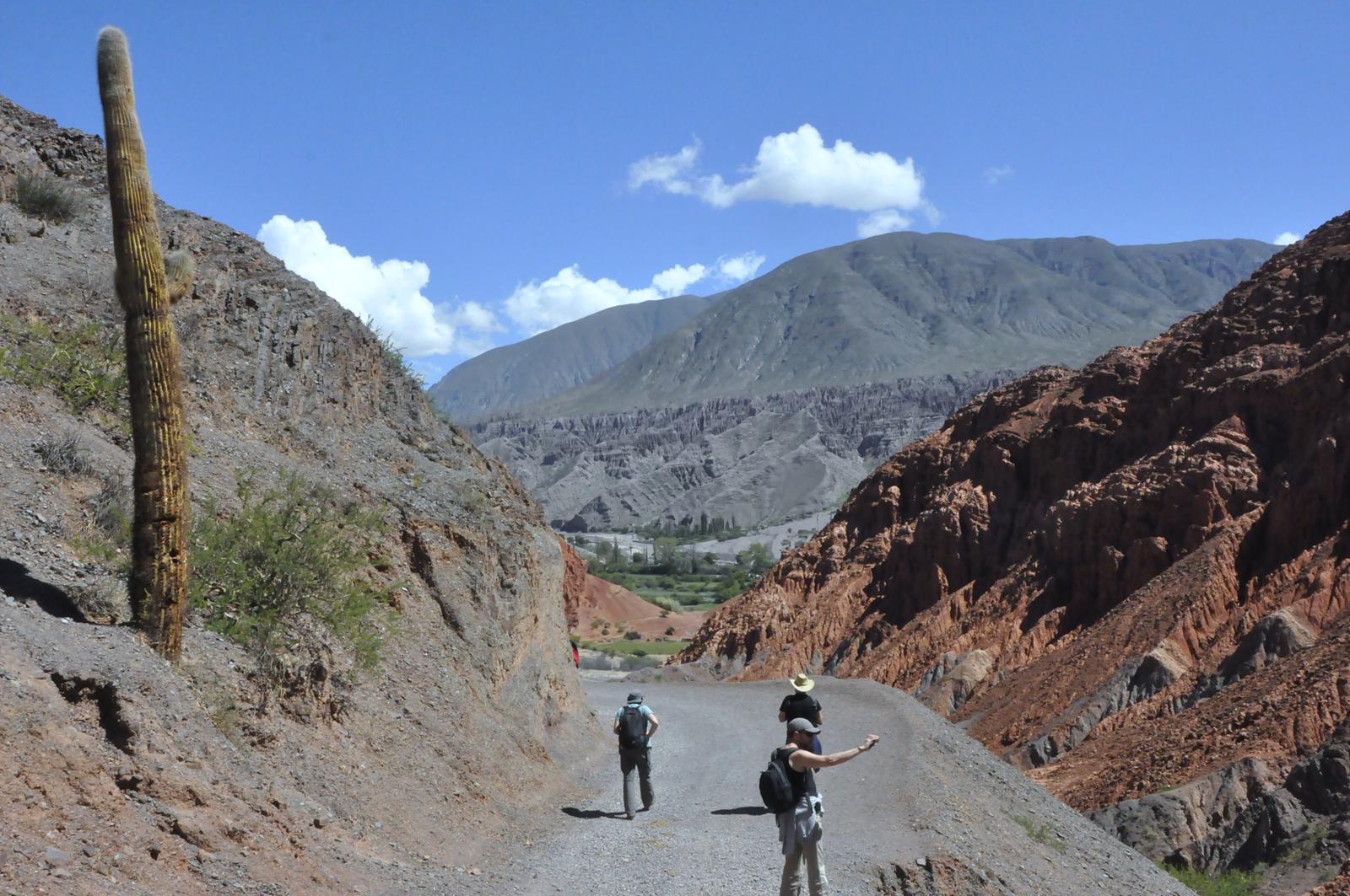 Wrażenia dziwne, bo kolory wzgórz i dalszych gór od samego początku nieprawdopodobne. Na powitanie intensywnie pomarańczowe wzgórza, dalej przechodzące w różne odmiany czerwieni, ale to dopiero wstęp, przed nami fioletowe wzgórza i skały! Pełna paleta kolorów i ich odcieni. Widoczność fantastyczna, niestety jest sobota i wszędzie tłum turystów. Na zakończenie wspinamy się na niewielki grzbiet skalny, który stanowi naturalny taras widokowy, skąd roztacza się przepiękny widok na Purmamarca i zieloną dolinę, otoczoną pomarańczowo - miedziowymi skałami.