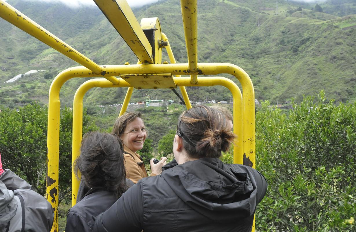 Widok na miasteczko, które leży w dolinie jest zasłonięty drzewami. Za to można podziwiać przeciwległe pasmo gór, które otacza Baños z drugiej strony. Słońce wychodzi zza chmur i poprawia nam humor.