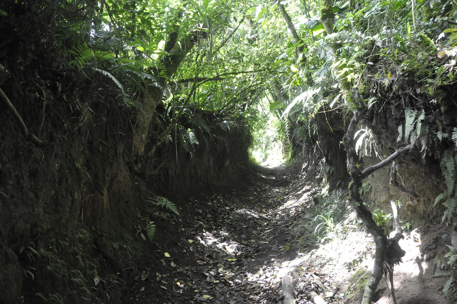 Ścieżka prowadzi wąwozem porośniętym drzewami i krzewami. Taka miniatura „Wąwozu Korzeniowego” z okolic Kazimierza. Dno wyłożone jest liśćmi, które tworzą cienki dywanik, po którym stąpam. Idę wypatrując węży, bo przypomniało mi się, gdzie jestem. W Ameryce Południowej są bardzo jadowite węże. Tyle, że chyba trzeba mieć szczęście (albo nieszczęście – w zależności od zakończenia tego spotkania) aby je spotkać. Tak jak z wulkanami...
