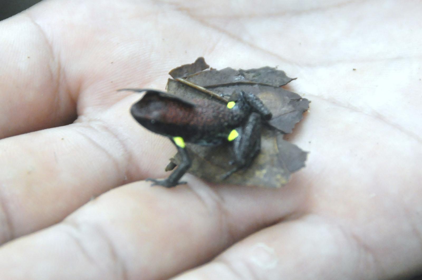 W lesie jest bardzo dużo różnych zwierzątek. Niestety, my mamy okazję obejrzeć tylko żabkę, o której David mówi, że jadowita i patyczaki. Jeden – brunatny na liściu, a drugi – zielony na mnie. Spadł z drzewa i wylądował na moim karku. Trochę dziwne uczucie, kiedy czuje się, że coś łazi po szyi, wtedy kiedy jest się w obcym lesie i nie zna tutejszych zagrożeń. Szczęśliwie patyczaki nie są groźne dla ludzi, więc skończyło się na szybszym biciu serca i napływie sił, co też jest dobre w tym klimacie.