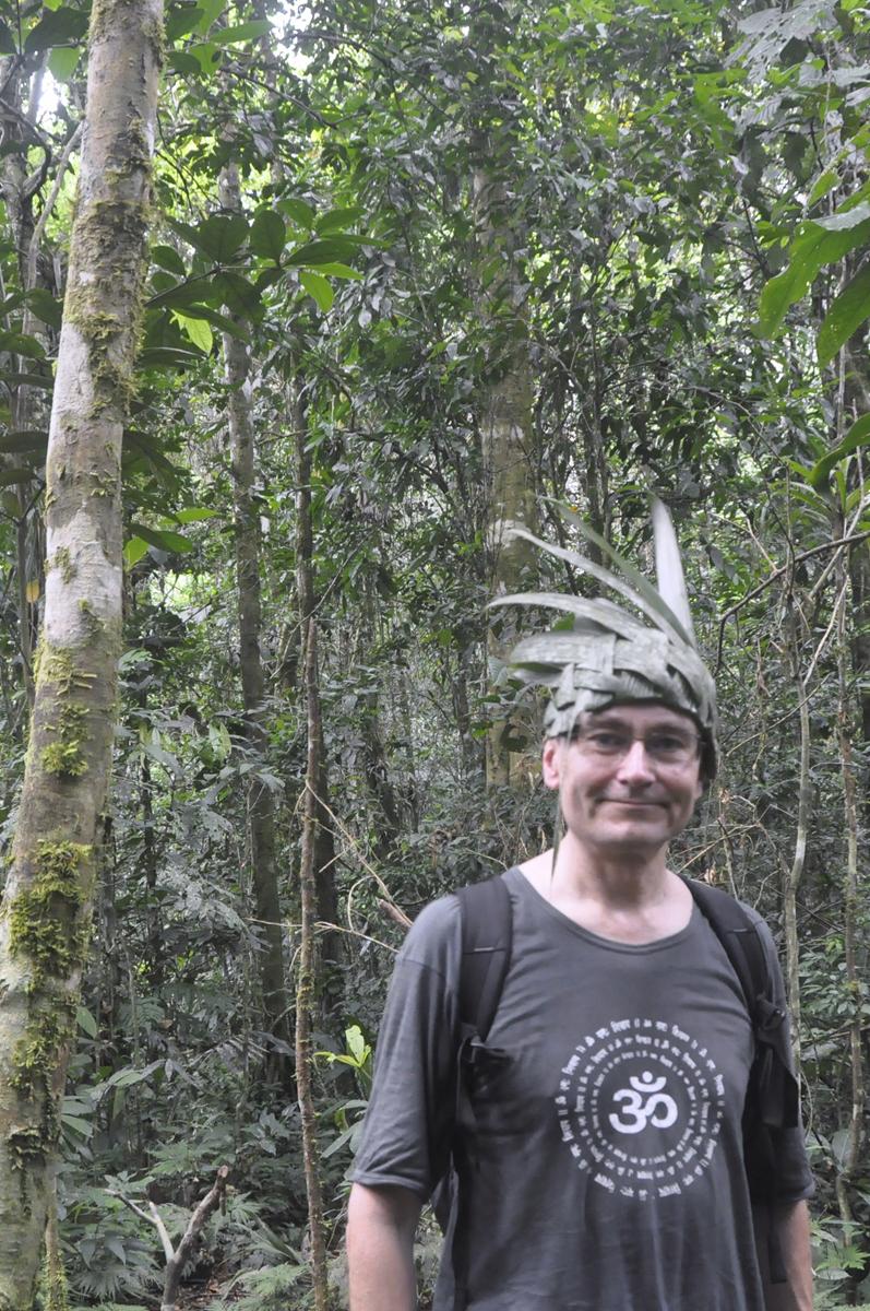 Nasz guido pokazuje nam jak miejscowy myśliwy robi z liści zasłonę, aby nie być widocznym. Przy okazji uplótł dla mnie koronę, ale że debilowato wyglądałem, więc długo jej nie nosiłem...