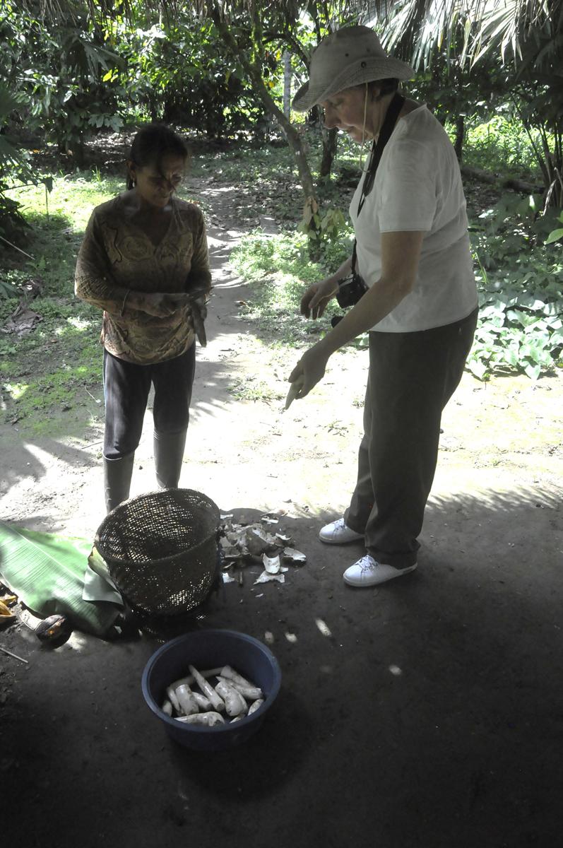 Pani miała uprzednio wykopane bulwy juki (albo manioku, jak kto woli), które zaczęła obdzierać z łupiny. Dołączyliśmy się do tych prac kuchennych z przyjemnością. Kiedy już poobdzieraliśmy i zostały gołe, białe bulwy, powędrowały one do gara. Garnek postawiony został na kuchni, za którą robiło ognisko. Pani podłożyła więcej drzewa aby się zagotowało, a my poszliśmy na pole.