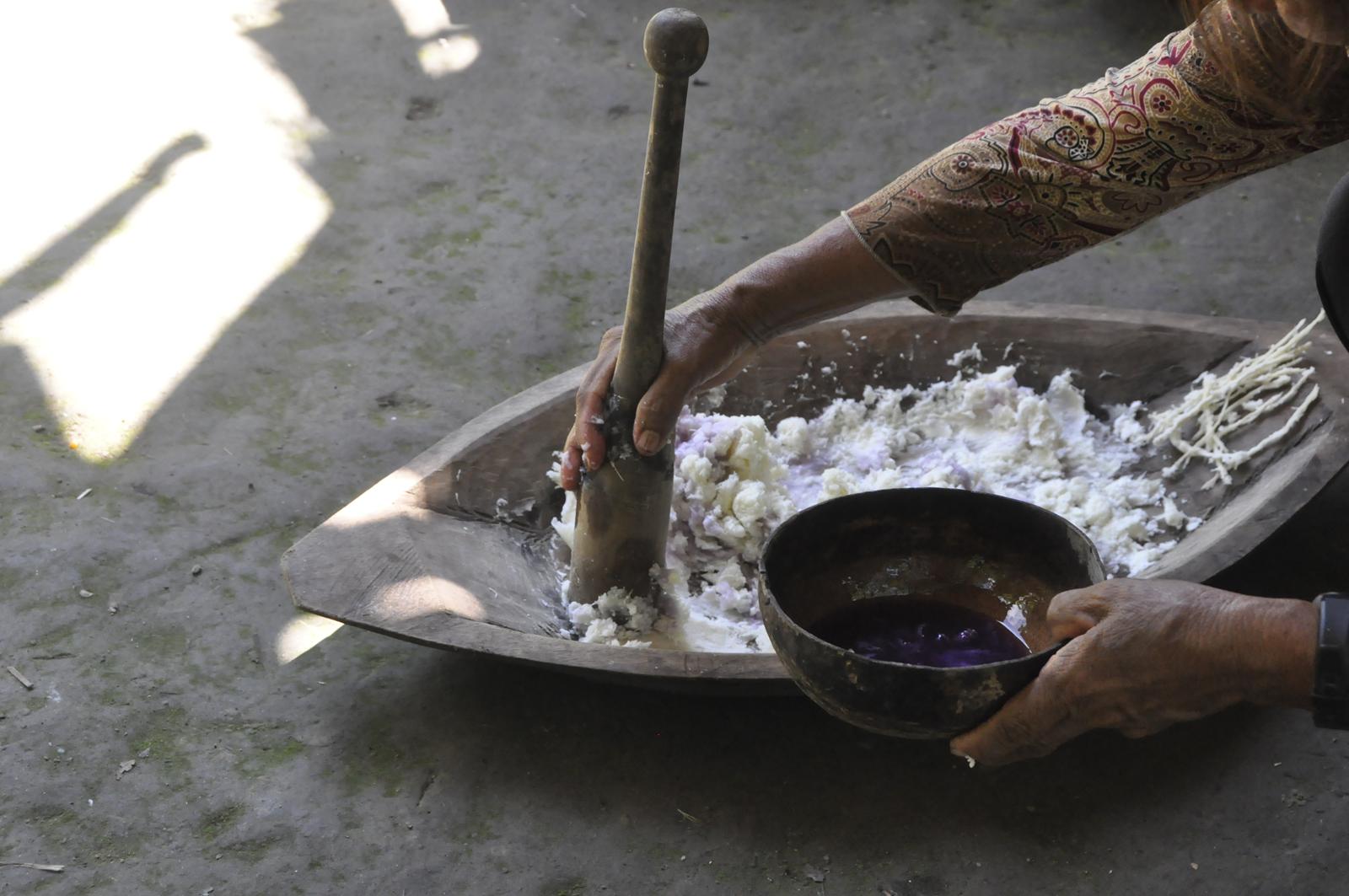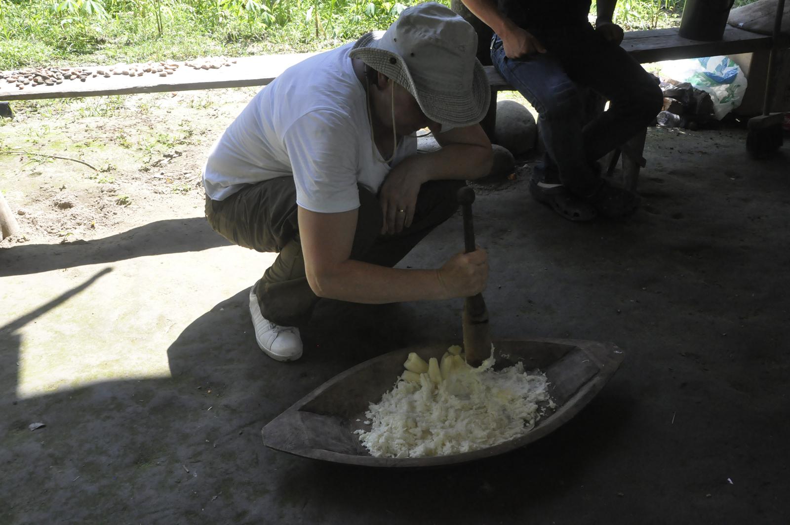 Kiedy wracamy do domu, juka już jest ugotowana. Bulwy zostają wyłożone na drewnianą misę i roztarte na miazgę. Próbuję trochę. W smaku, podobne do naszych nieposolonych ziemniaków. Jakby posolić, to dałoby się zjeść, zresztą wszystko zależy od tego, jak długo się nie jadło...