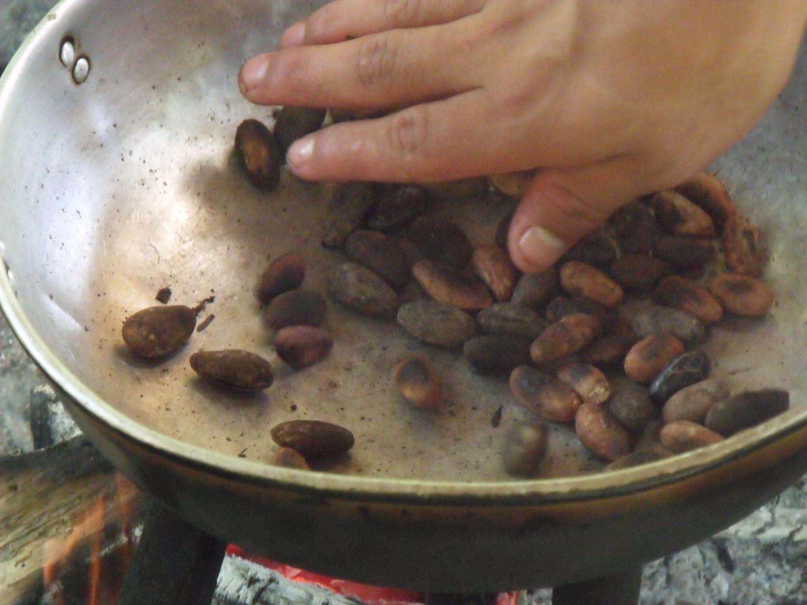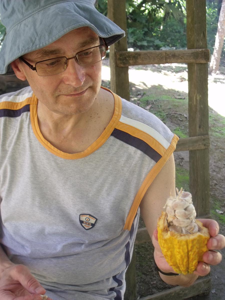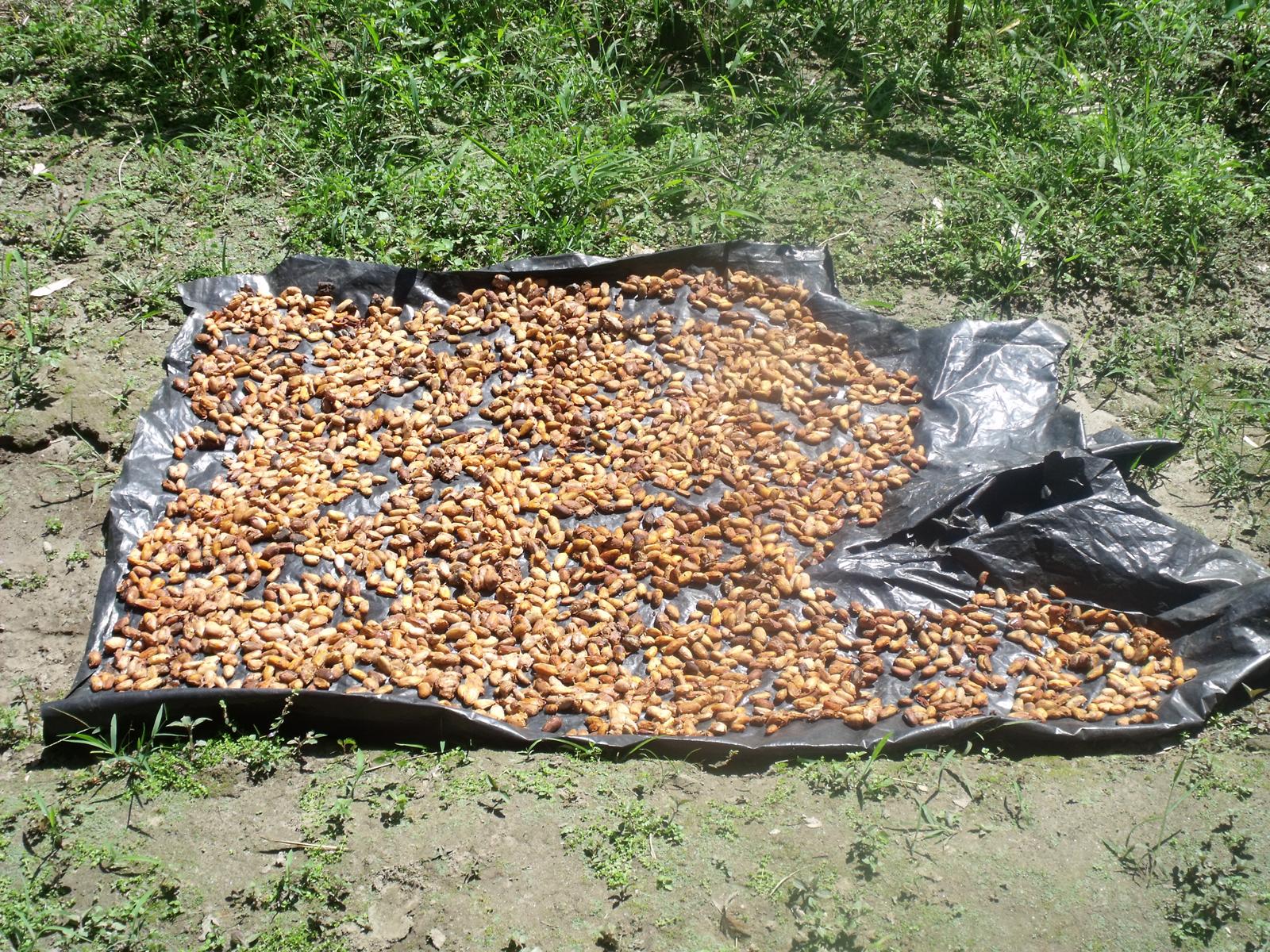 W pobliżu chatki, w słońcu, na czarnej folii suszą się jakieś ziarenka. Są wielkości naszego bobu. To kakao. Te, które się suszą, są jeszcze niedobre, zbyt wilgotne. Aby ziarno kakaowe nadawało się do przetwarzania, musi nabrać ciemnobrązowej barwy. Prawie czarnej. Takie ziarenka czekają na nas.