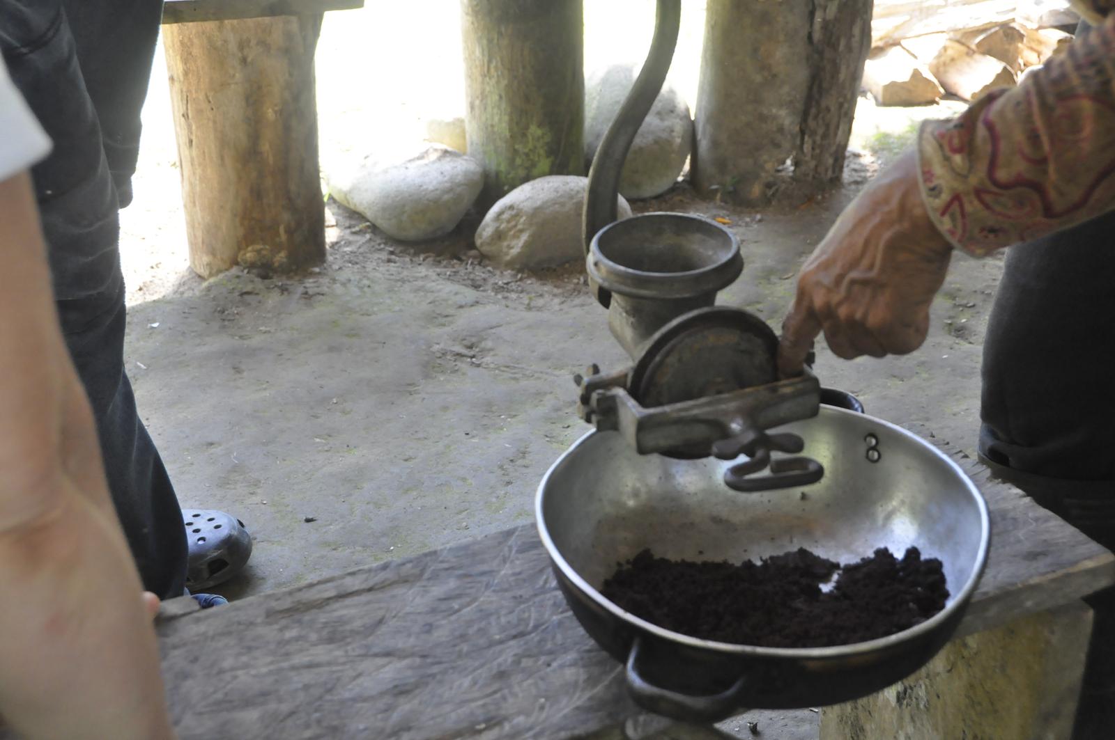 W normalnym młynku, ale ze specjalną nakładką, ziarna kakaowca zostają zmielone na miazgę. Nawet sporo tego wyszło.