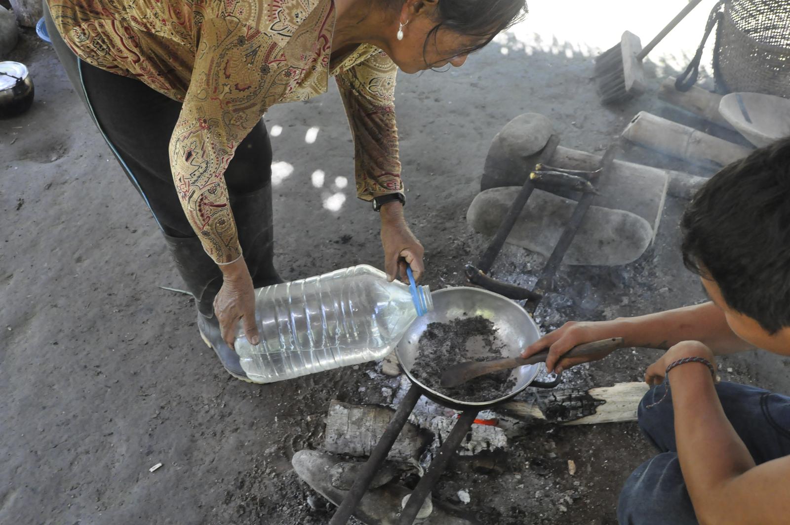 Teraz, kiedy już maniok (juka) została roztarta, pani dolewa do niej jakiegoś fioletowego płynu. David tłumaczy, że dawniej, jukę kobiety żuły i wypluwały, aby doprowadzić do fermentacji, teraz robi się to higieniczniej. Kobiety już nie żują, tylko dolewają specjalnego płynu, który powoduje, że miazga, po kilku dniach zaczyna fermentować. Tak robi się piwo.