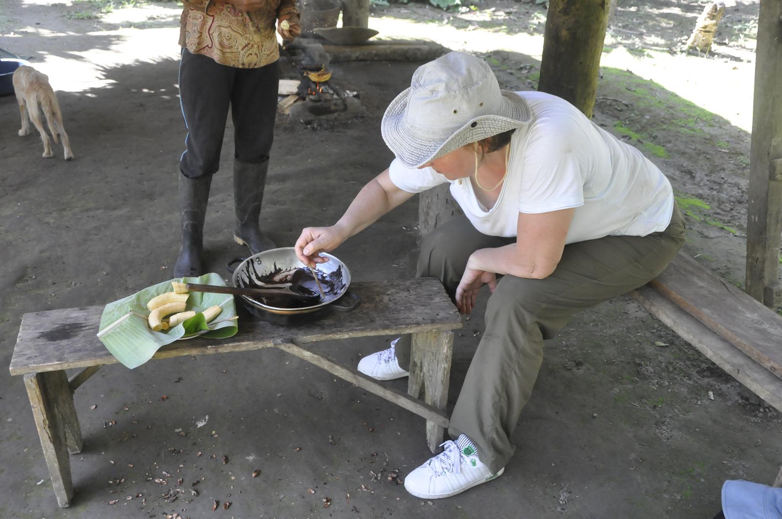 Teraz do miazgi pani dosypuje cukier i stawia na ogniu. Cały czas miesza, a kiedy cukier zaczął się karmelizować, dolewa wody. Teraz trzeba szybko mieszać. Miesza David, mieszam ja, miesza Pani Ela, aż wreszcie domieszaliśmy... Jest czekolada !