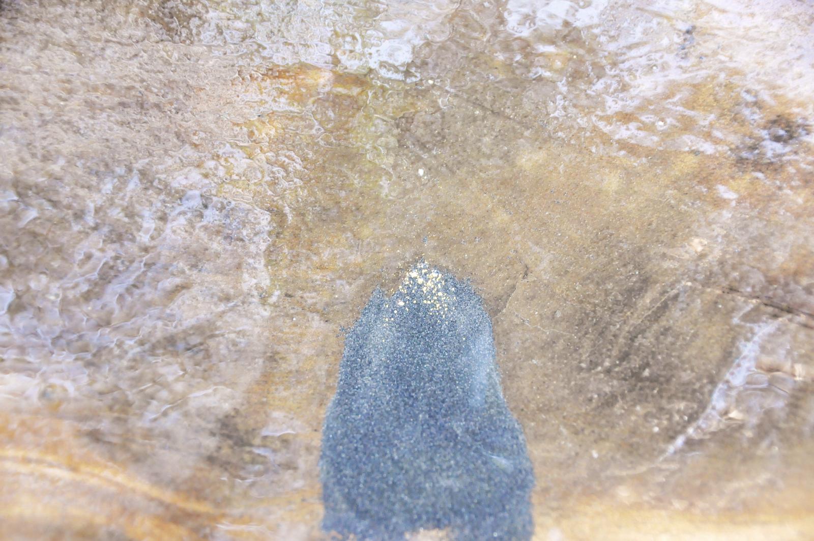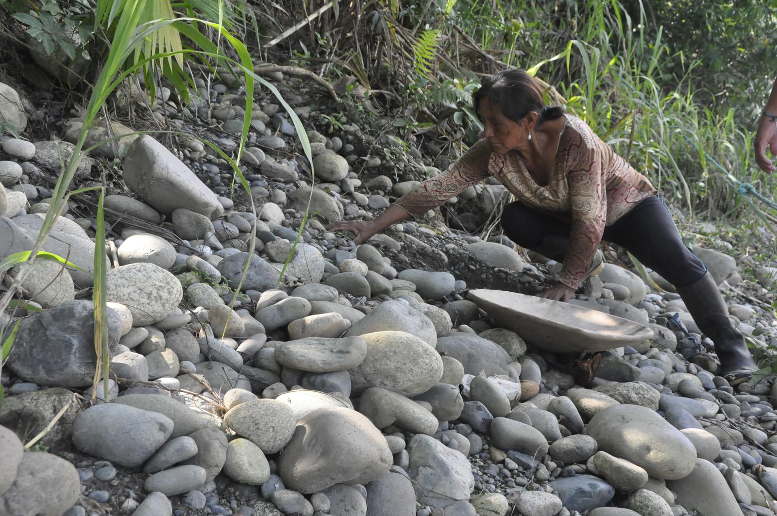 Pani odgarnia większe otoczaki na bok i dobiera się do żwiru. Nakłada na misę czubatą porcję ziemi. Niesie do rzeki i powoli, wykonując okrężne ruchy misą usuwa nadmiar. Trwa, to jakieś 5-8 minut. Kiedy na dnie misy pozostaje już tylko drobny piach, ruchy stają się powolniejsze i ostrożniejsze. Powoli pozbywa się piachu, aż wreszcie na dnie, widać coś żółtego. Drobinki złota.