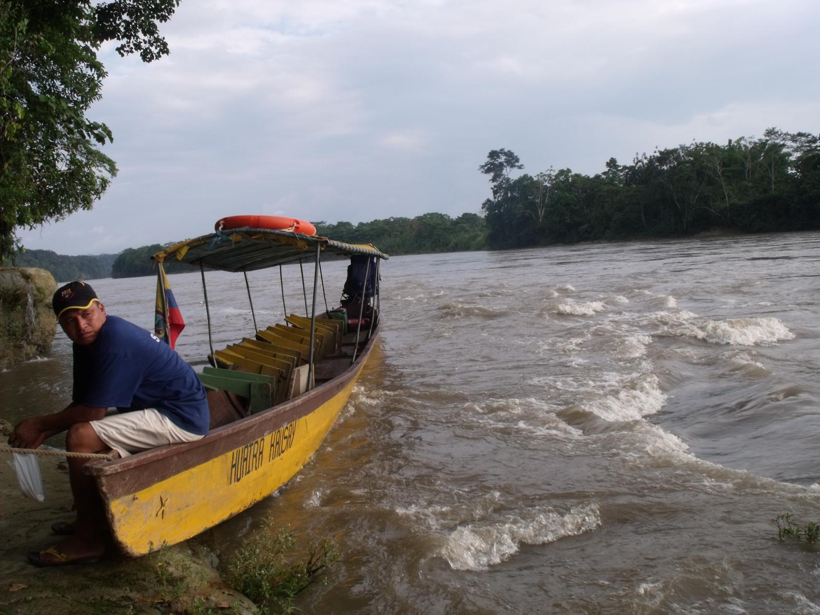 Po trzech kwadransach dojeżdżamy na brzeg rzeki. Zmiana środka transportu. Przesiadamy się na łódź.