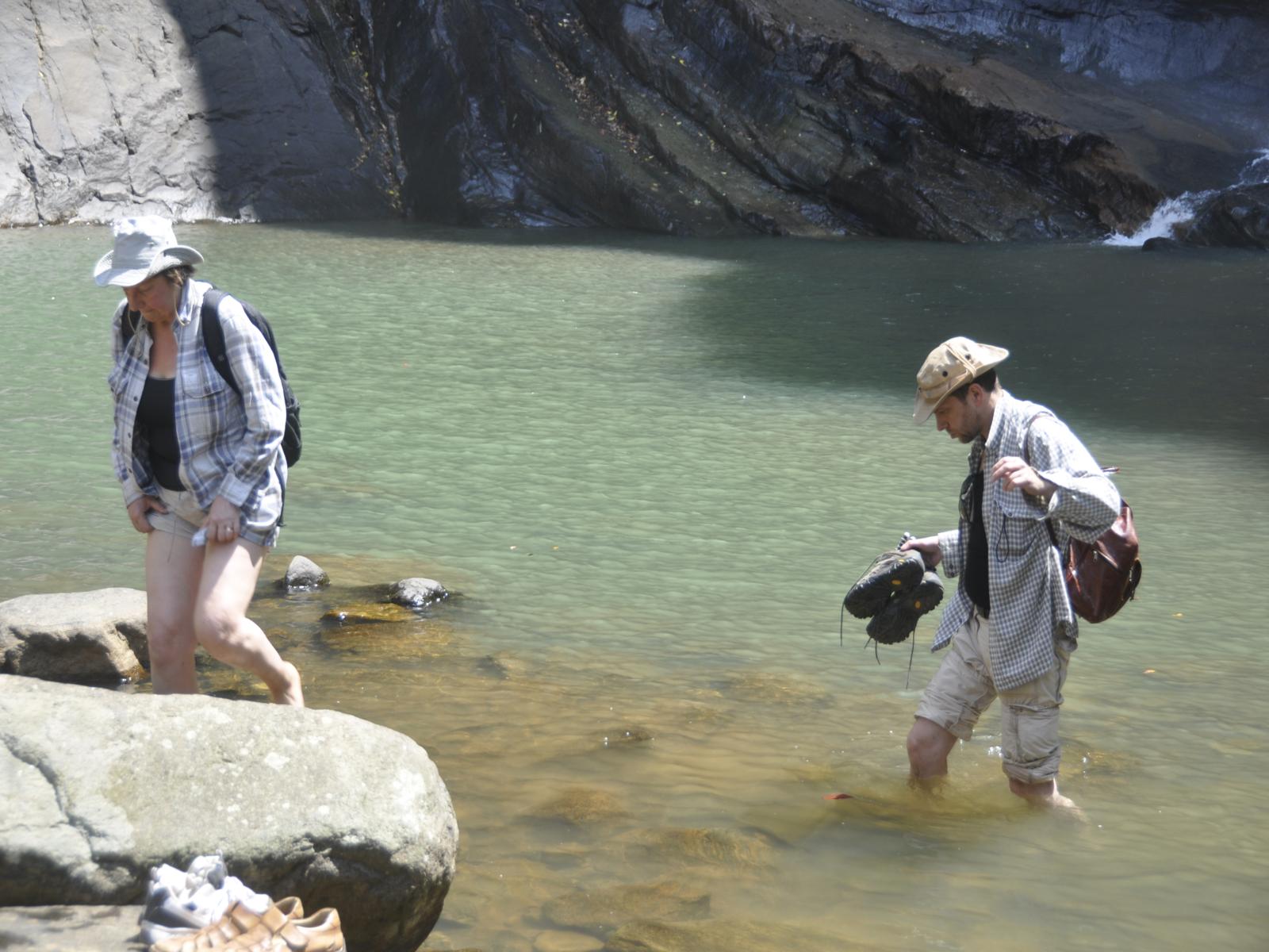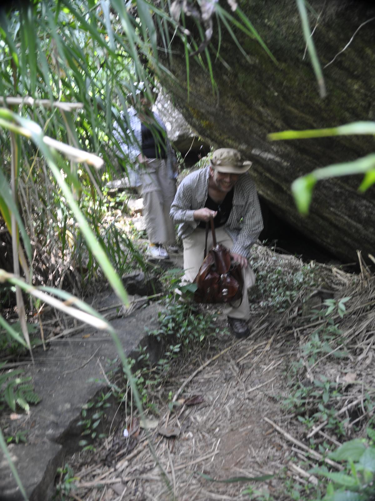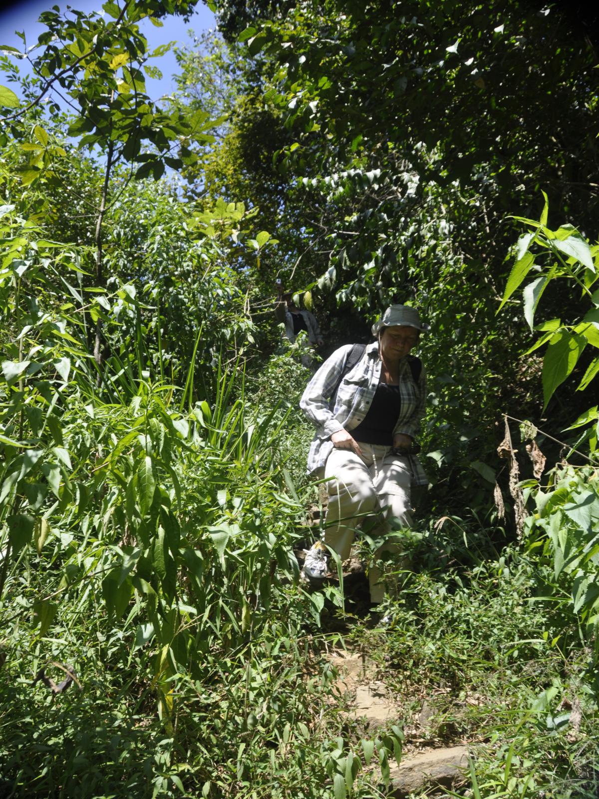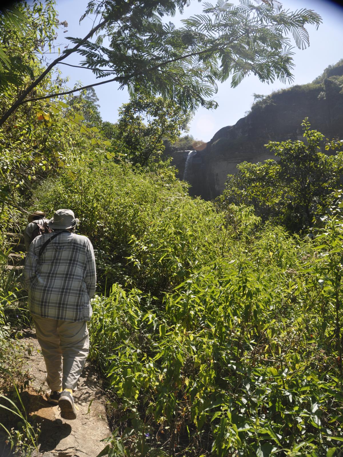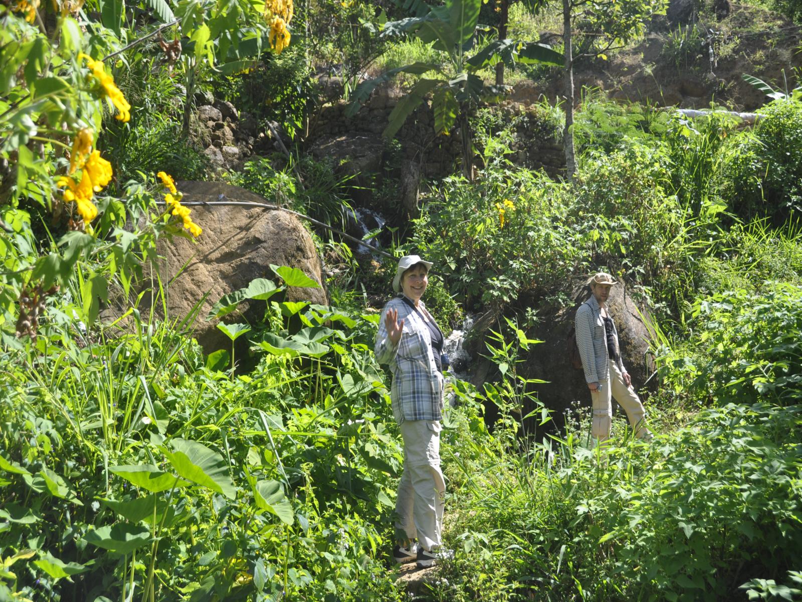 Idziemy do tego położonego na górze. Prowadzi do niego ścieżynka biegnąca brzegiem wąwozu, na dnie którego płynie rzeczka, zamieniająca się czasami w małe jeziorka. Wszystko obrośnięte bujną równikową roślinnością. Czasami idziemy, czasami wręcz, przedzieramy się przez zarośla.