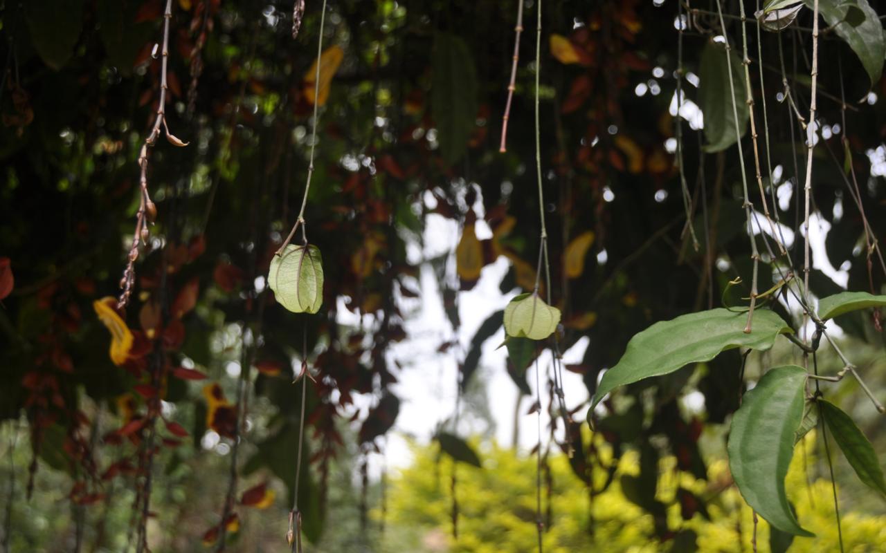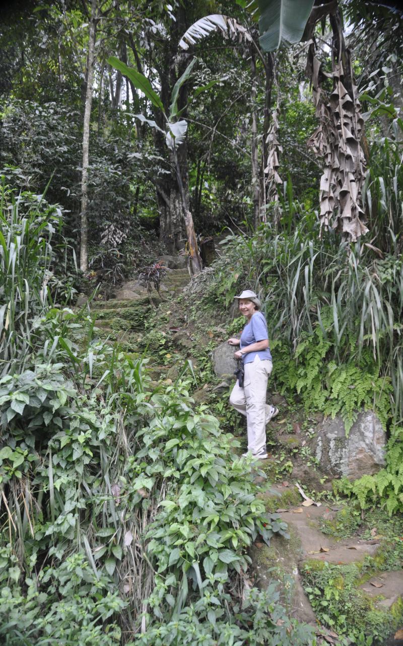 Zejście jest bardziej strome. Za to po schodkach. Prowadzi wśród krzewów herbacianych i Kasia, jako znająca się, pokazuje jakie listki są zbierane. Każe nawet jeść, twierdząc, że dają energię. Napaśliśmy się i z energią, która została nam dana poszliśmy dalej.