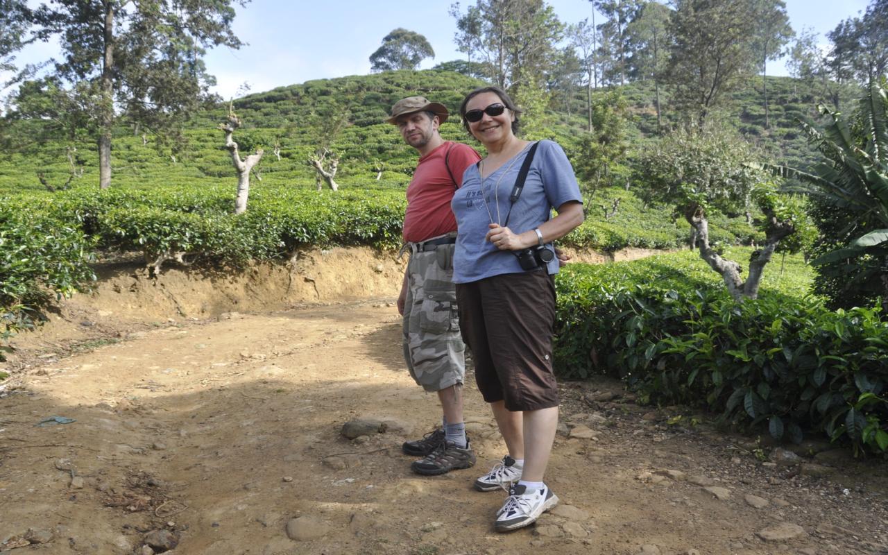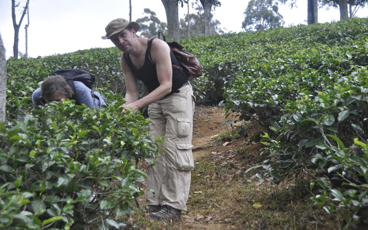 Ta boczna uliczka okazała się obwodnicą Elli. Prowadzi wśród pól herbacianych i samotnie stojących na wzgórzach domków Lankijczyków. Mamy okazję wejść na takie pole i dokładnie sobie obejrzeć krzew herbaty. Pani Ela nawet spróbowała.