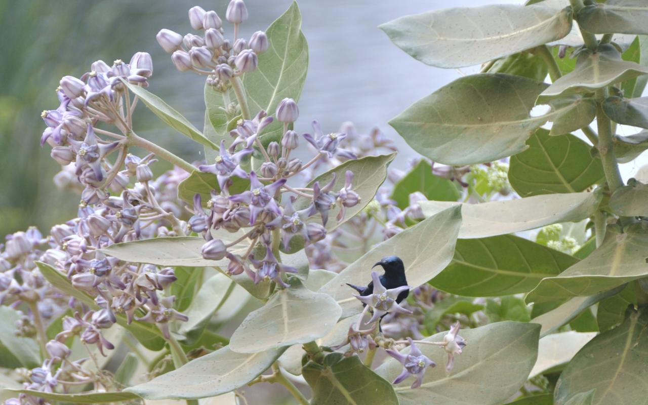 Udaje mi się na kwitnącym krzaku wypatrzeć malutkiego koliberka (tak myślę, że to koliberek), który dobiera się do kwiatów. Przelatuje od jednego kielicha do drugiego, a na pierwszy rzut oka wygląda, jak wielki, granatowy motyl (kiedy leci, bo jak przysiądzie, to po prostu 1/3 wróbla)...