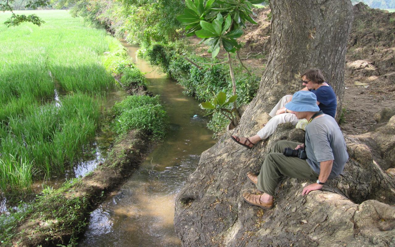 Jezioro jest położone jakieś 10 minut drogi od naszego hostelu. Idzie się dobrze, najczęściej w cieniu. Jezioro wygląda mi raczej na staw, bo położone jest wyżej. Jakiś metr nad polami. Od pól odgradza je nasyp na którym poprowadzona jest droga. Dosyć często użytkowana przez miejscowych, którzy śmigają obok nas wzniecając tumany kurzu. Szczęśliwie wieje lekki wiaterek od jeziora, więc możemy się odpowiednio ustawić, aby nie było to uciążliwe.