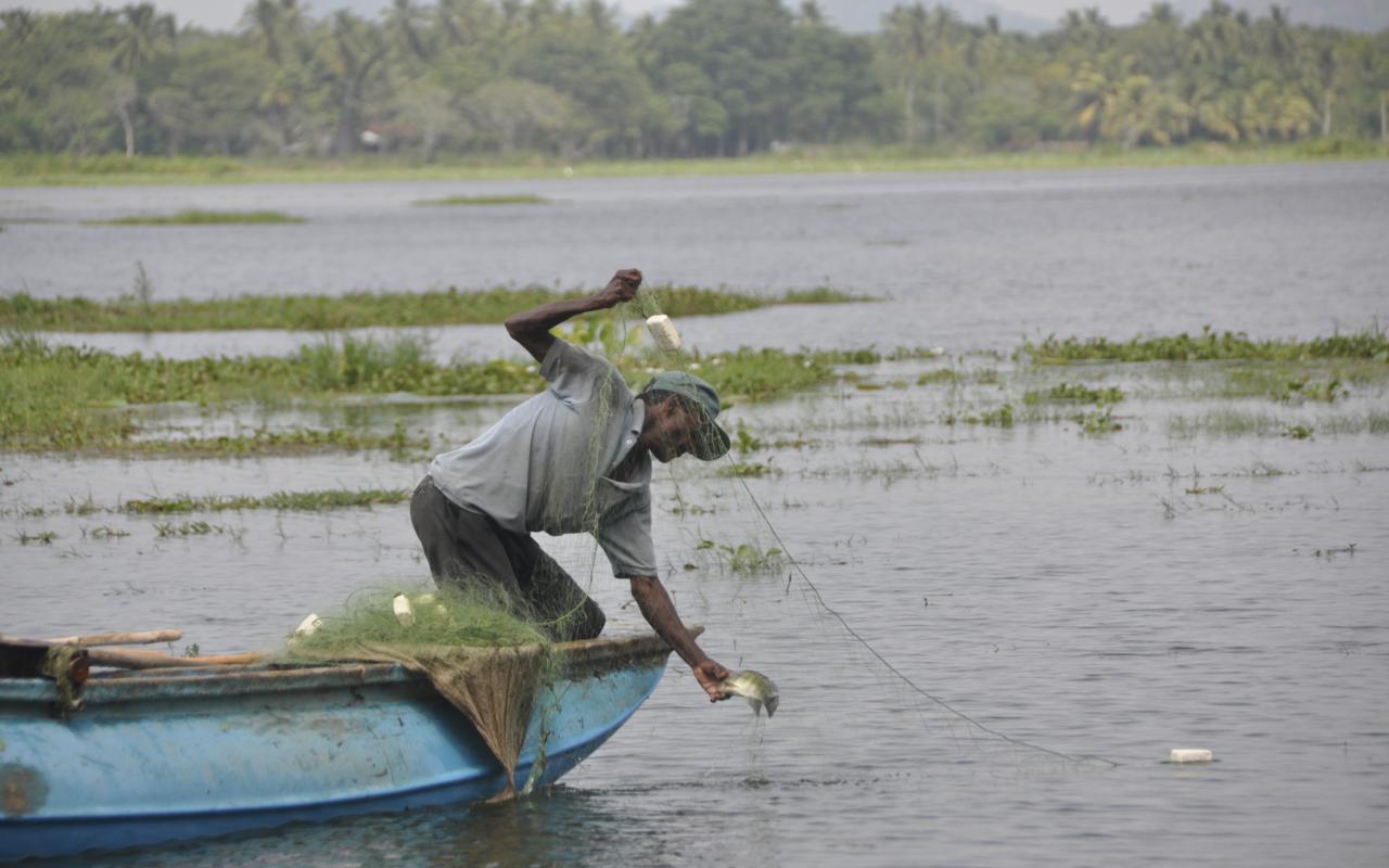 Z jednej strony pole ryżowe, na którym widać pracującą kobietę, z drugiej jezioro i zarzucający sieci rybak.
