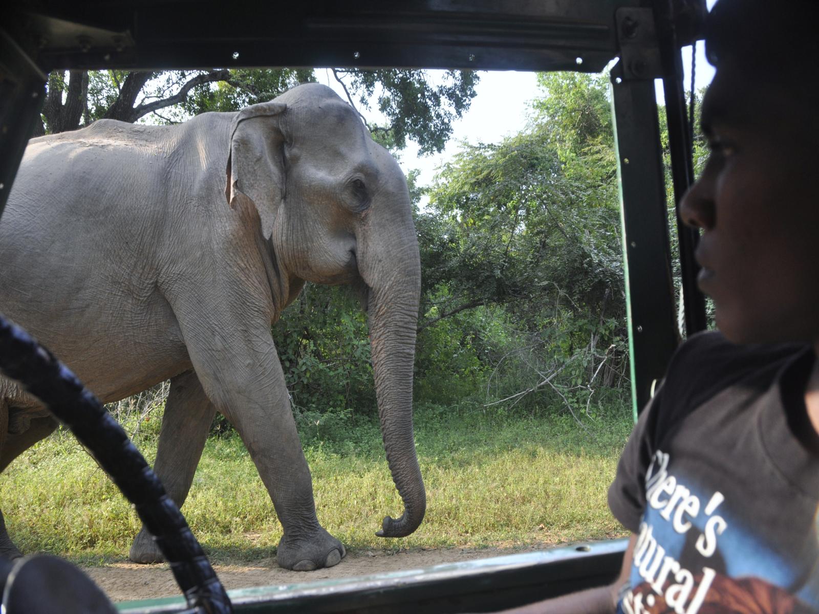 Jadąc drogą, w pewnym momencie widzimy idącego środkiem słonia. Kierowca zjeżdża na pobocze i widać, że jest bardzo nieszczęśliwy, nie mogąc wjechać do buszu. Kładzie palec na ustach. Każe być cicho. Słoń przechodzi w odległości metra od nas. Kiedy minął samochód, nasz przewodniko-kierowca odetchnął z ulgą. Chyba się trochę obawiał...