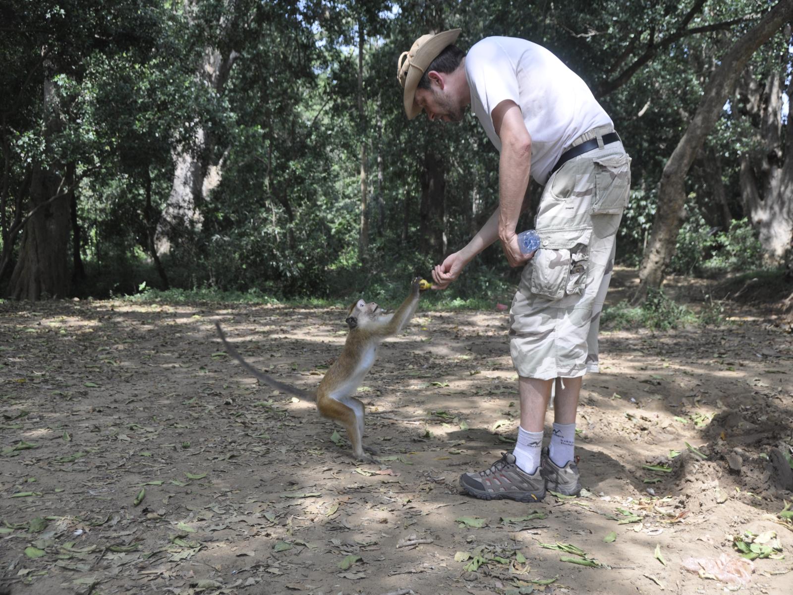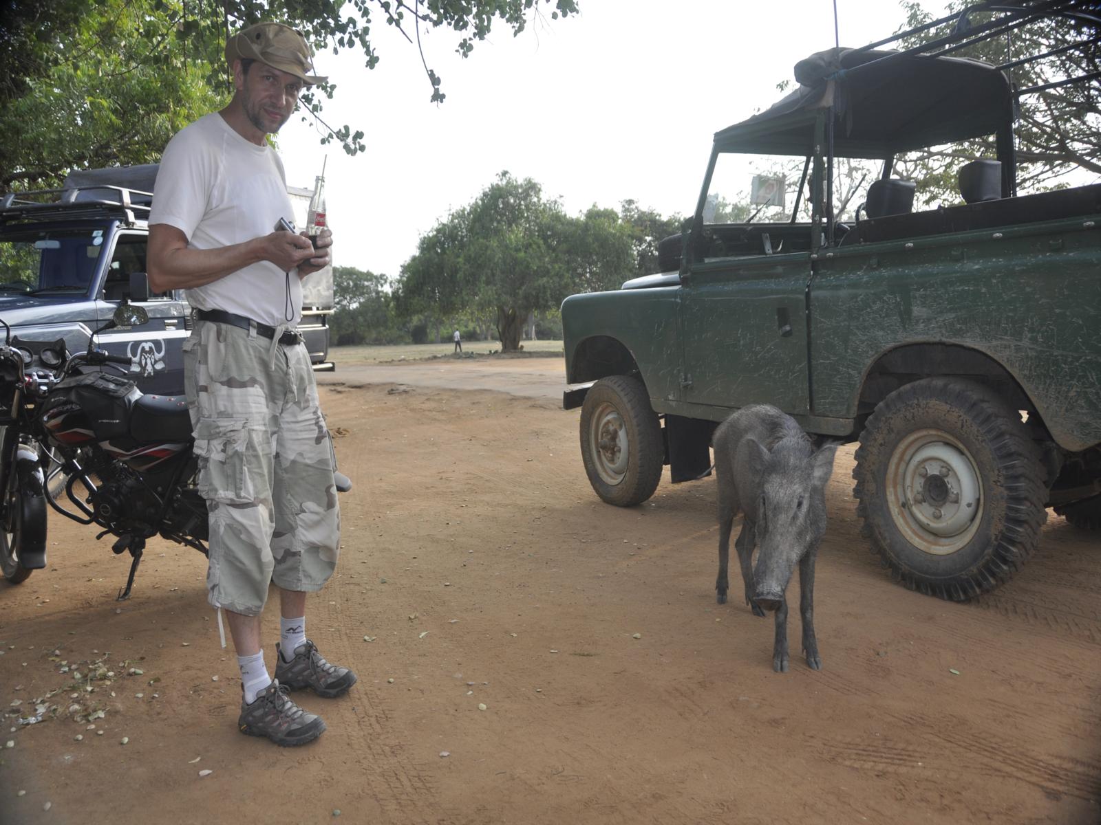 Wyjeżdżając z Yala Park zatrzymujemy się w przydrożnym sklepiku na colę. Taki krótki postój po przebytych wrażeniach. Widać, że to okolica rezerwatu, bo włóczą się półdzikie guźdźce. Jeden (właściwie, to jedna), wybrał sobie Wienia i żebrze. Niestety, nic nie mamy do jedzenia, więc po chwili odszedł szukać szczęścia w kupce odpadków za sklepikiem.