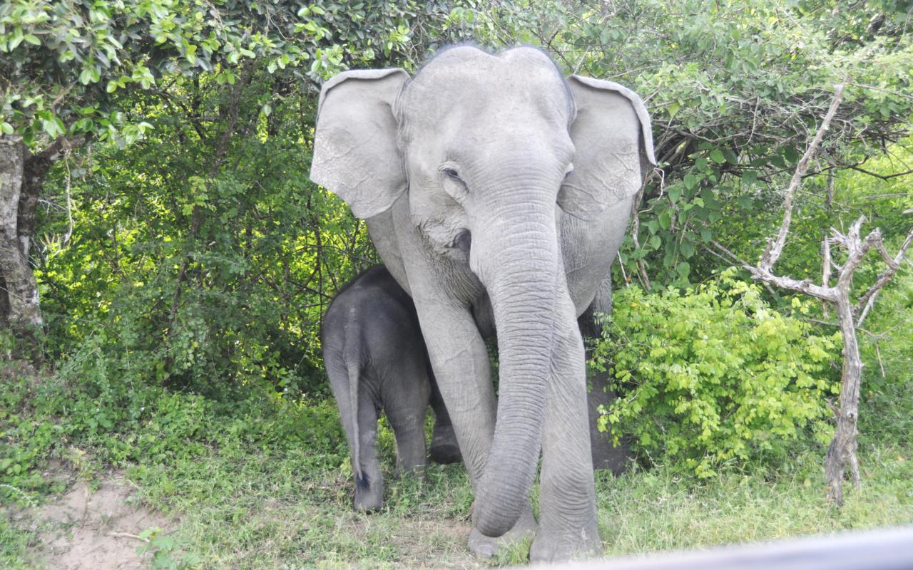 Jedna słonica z małym nawet się troszkę zdenerwowała na Panią Elę, która wychyliwszy się z samochodu trzaskała jedno zdjęcie po drugim. Okazała swoje zaniepokojenie jeżąc włoski na głowie, wachlując uszami i grzebiąc nogą. Kierowca lekko zbladł i zaczął syczeć kładąc palec na ustach. Ucichliśmy. Słonica ze słoniątkiem powoli się oddaliła...