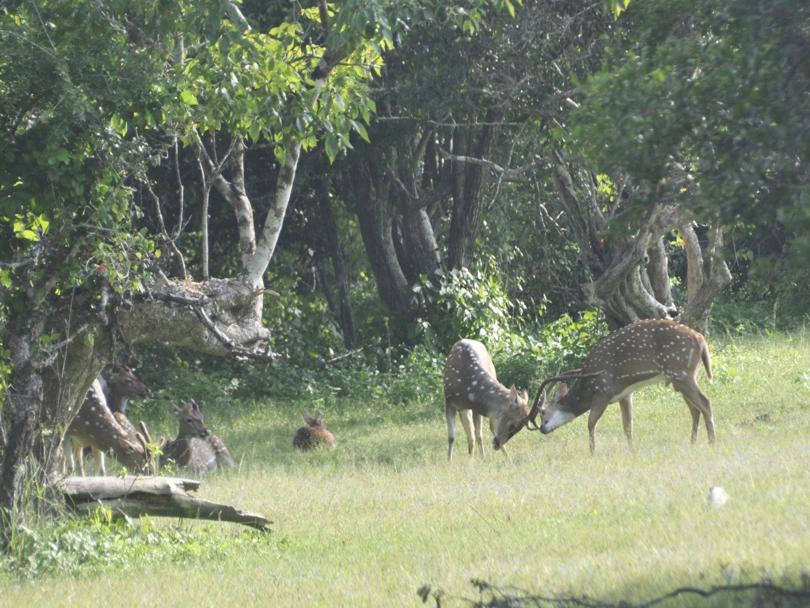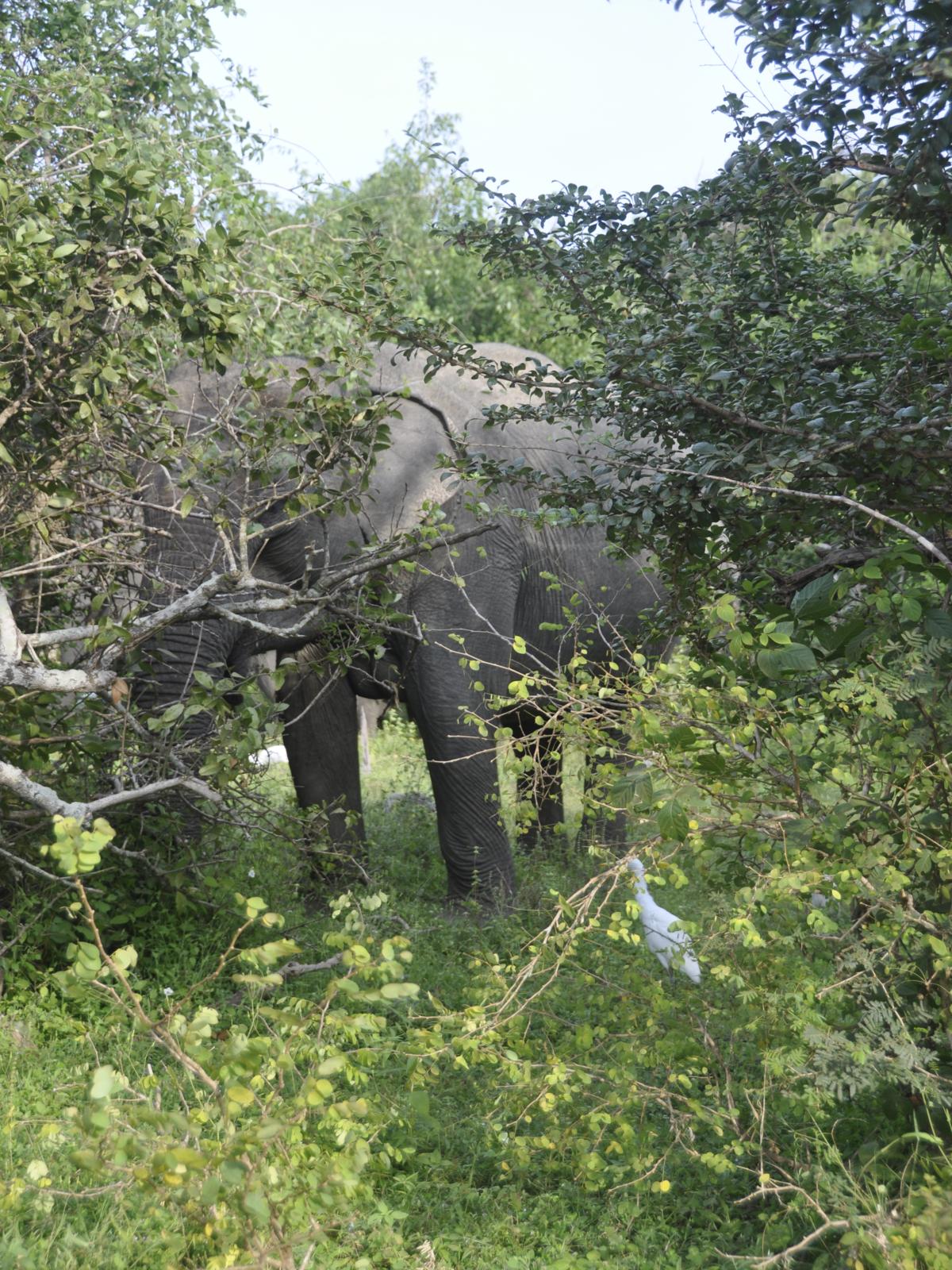 No i szczęści się! Jeżdżąc po dróżkach mamy okazję podziwiać faunę rezerwatu. Trafił się słoń zajadający liście z drzewa rosnącego nad jeziorkiem, bawoły, pasące się w stadzie, paw dumnie rozkładający ogon... Są zwierzaki!