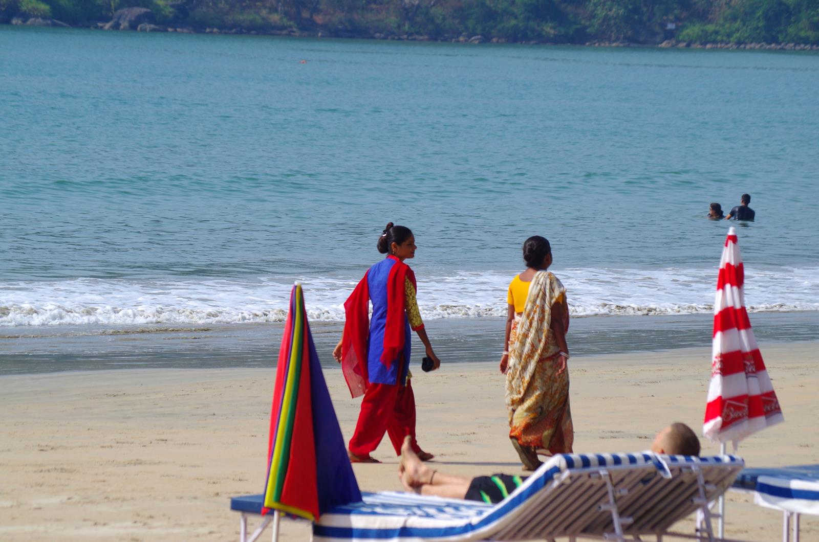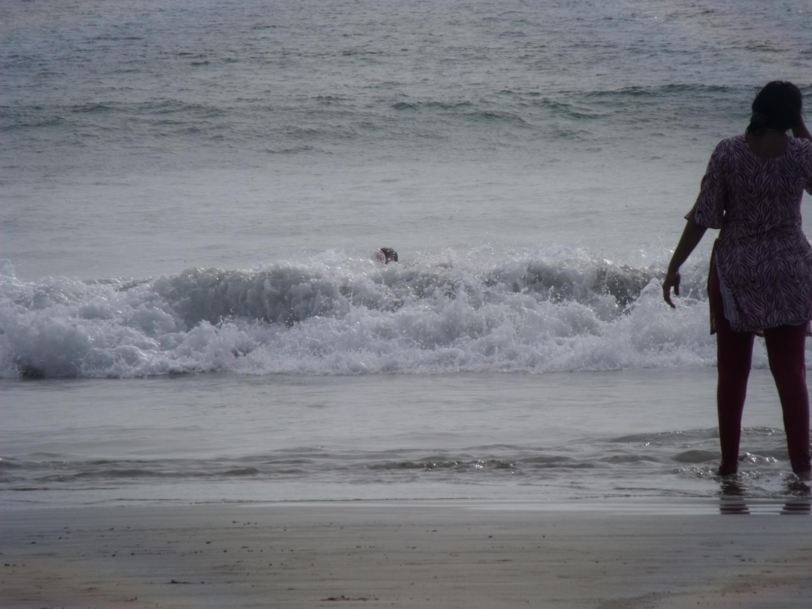 Idziemy się wykąpać w morzu, woda wspaniała czysta i płytka, rano praktycznie nie ma fali. Miejscowe kobiety kąpią się, albo raczej tylko zanurzają się w morzu w sari (nie rozbierając się).