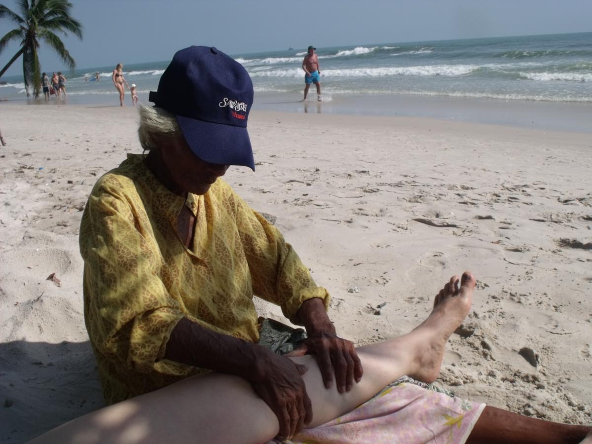 Ostatniego dnia pobytu w Hua Hin postanowiliśmy poleniuchować, poszliśmy na miejscową plażę, gdzie przeżyliśmy szok – małe i brudne kawałki piasku w większości zagospodarowane przez miejscowe restauracje – to plaża miejska w Hua Hin. Morze też nie było zachęcające. Wysokie fale zbijały z nóg, o kąpieli nie było co marzyć. Wytrzymaliśmy przez dwie godziny, w tym czasie umiliłam sobie pobyt korzystając z usług masażystki nóg. Babcia chociaż stara, miała niesamowicie mocne ręce.