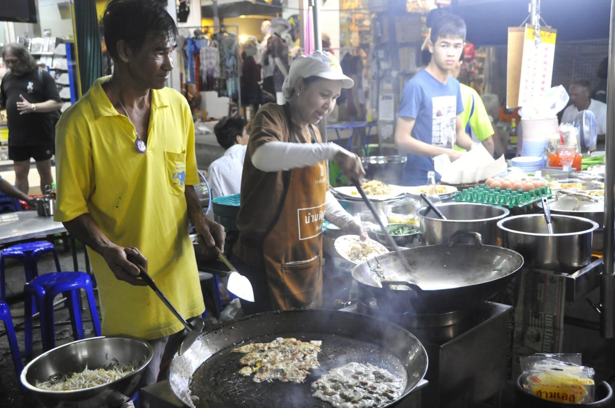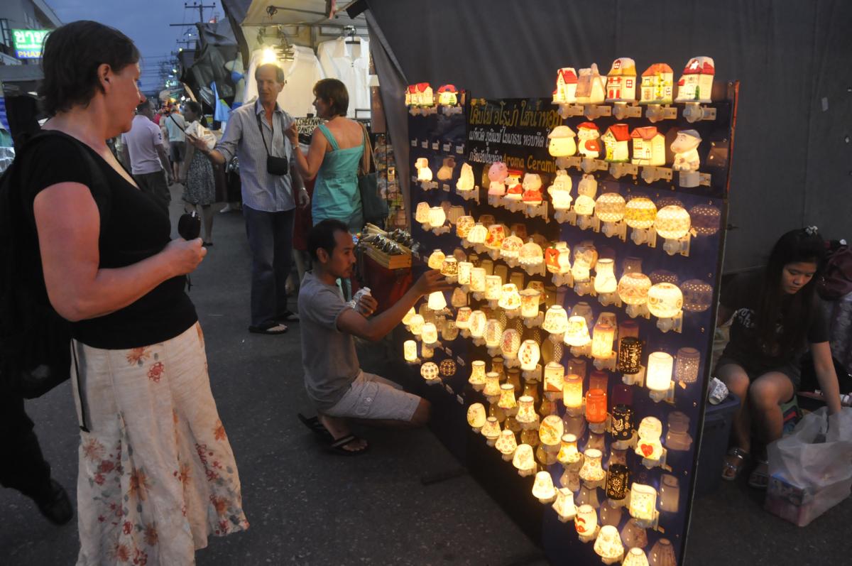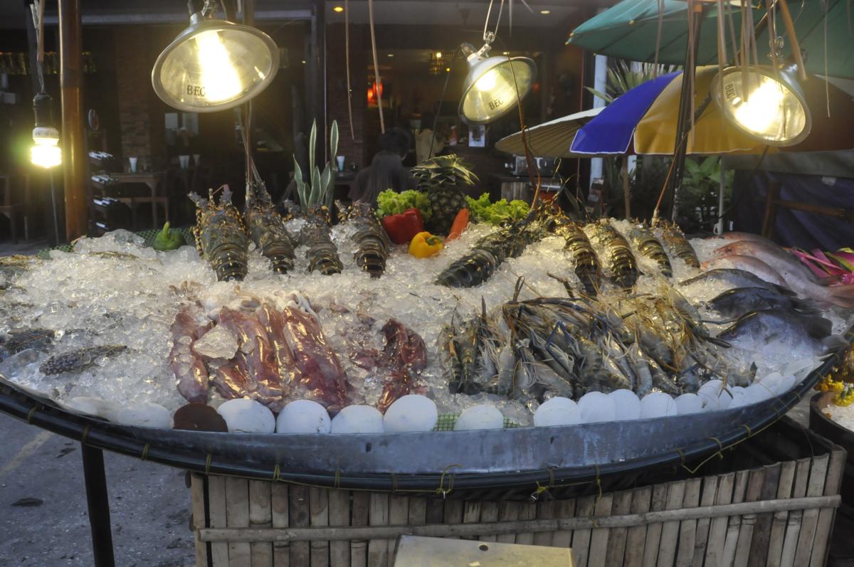 Kiedy się ściemniło poszliśmy obejrzeć targ nocny, z którego słynie Hua Hin. Na początku targu oblężone było stoisko typu miejscowy fast food - oczywiście skorzystaliśmy. Za równowartość 2 zł zjedliśmy danie przygotowane w woku. Był to makaron ryżowy z warzywami i jajkiem, do tego dostaliśmy pęczek trawy cytrynowej, kawałki bambusa i bliżej nieokreślone sosy. Całość wyśmienita, świeża, smaczna i pożywna. Na targu mnóstwo świeżych owoców morza, bardzo ładnie wyeksponowanych przed restauracjami lub wprost na straganach. Jak dla nas wielkie homary i inne duże okazy mają za wysokie ceny, ale chętnych w restauracjach nie brakowało. Zamiast na jedzeniu skupiliśmy się na pamiątkach(jak zawsze w liczbie mnogiej, ja się nie skupiałem), których było zatrzęsienie.