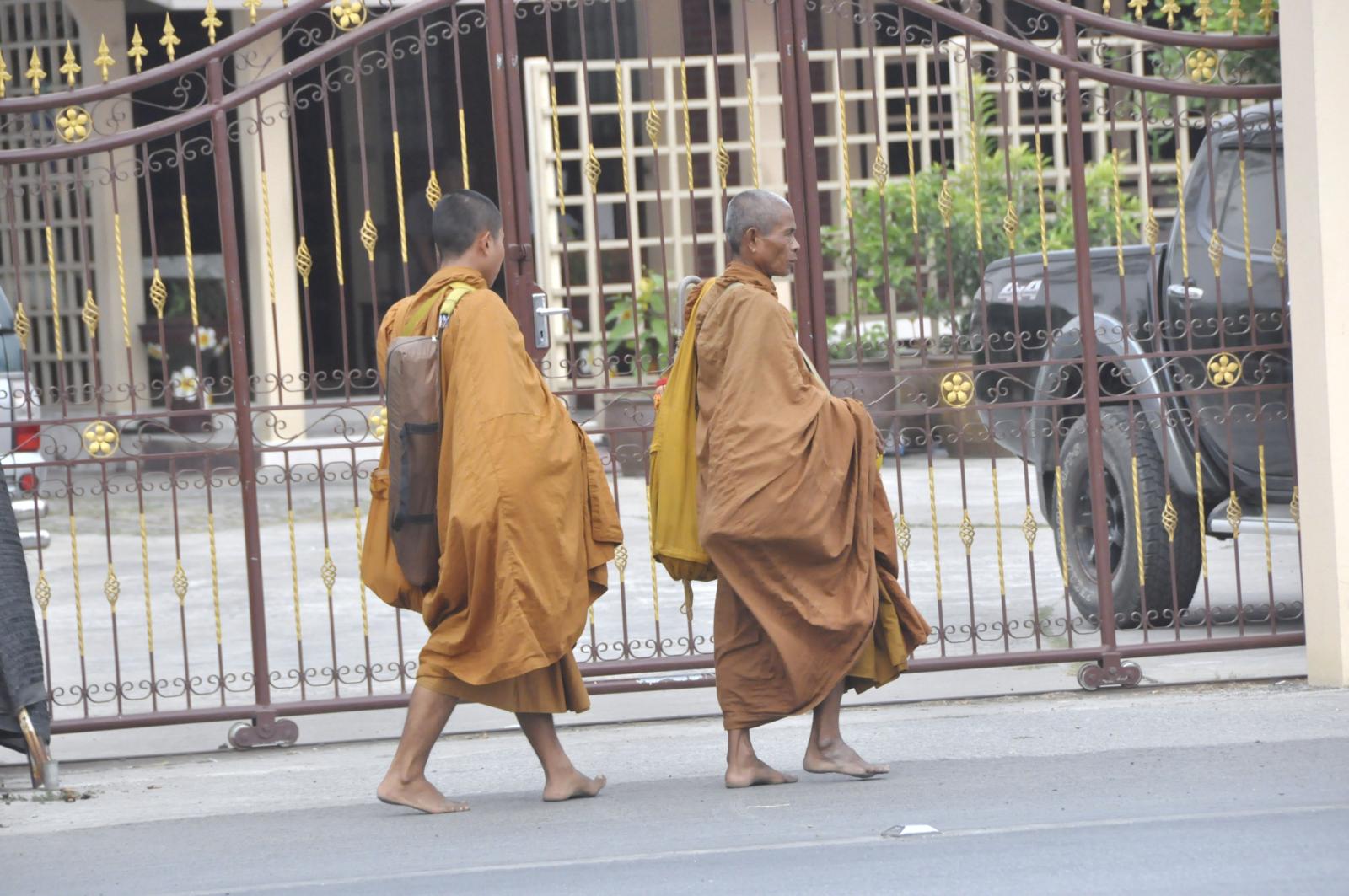 Na chodniku, tuż przy ruchliwej jezdni, klęczało dwoje młodych ludzi, nad nimi stało dwóch mnichów, którzy śpiewnie recytowali mantrę. Mnisi zbierali, jak co rano, jedzenie do swoich worków, zapewne dziękowali właśnie za posiłek.