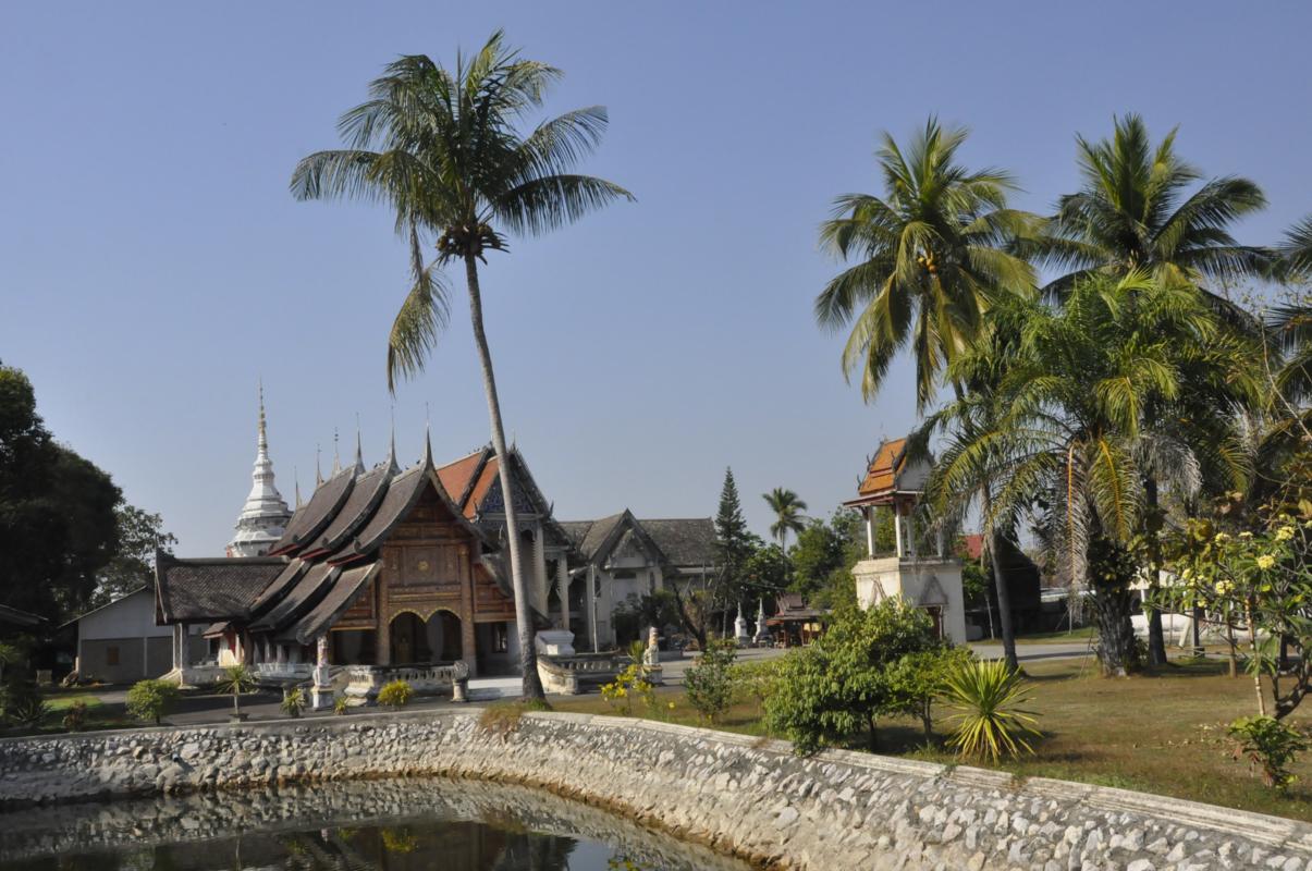 Dochodzimy do prześlicznie położonej wśród drzew świątyni Wat Pongsanook, gdzie spędzamy trochę czasu. Szukając mostu przez rzekę Wang odkrywamy piękną skarpę nadrzeczną.