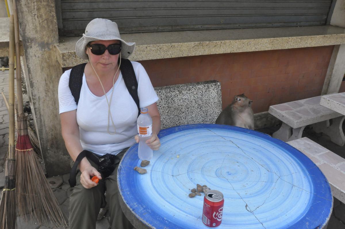 Przy wyjściu z jaskini, aby się pozbyć natrętnych małp, których było tam mrowie nazbierałam małych kamieni. Kiedy usiedliśmy na ławce przy miejscowym barku obok nas natychmiast pojawiło się całe stado małp. (Takie tam i stado... A że jedna usiadła z nami przy stoliku... Ucywilizowana...) Przejście przez drogę, którą okupowało kilkadziesiąt małp nie należało do przyjemnych, jakoś daliśmy radę i żadna nas nie zaatakowała.(Pewno, że nie zaatakowała. Małpy nie są głupie i potrafią wyciągać wnioski. W jednej ręce każde z nas miało kilka kamyczków, które nieśliśmy, tak, aby widziały, a w drugiej gruby kij.)
