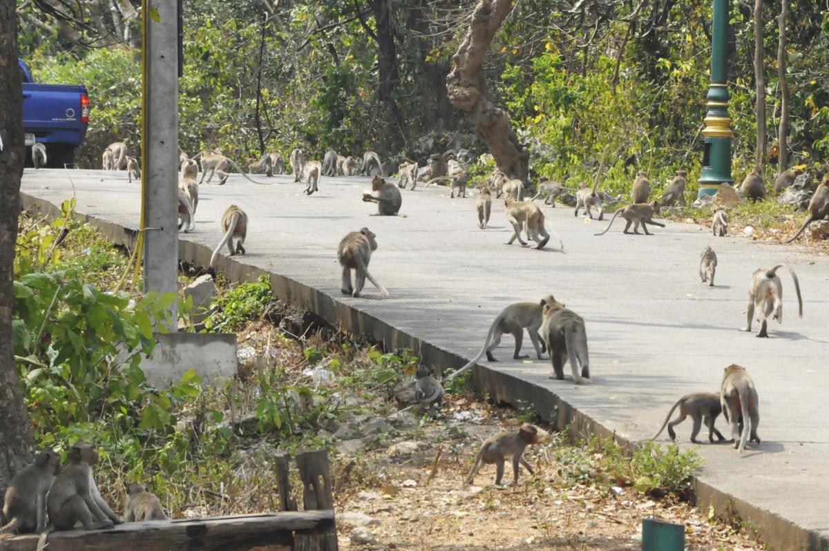 Poszliśmy zobaczyć polecaną jaskinię Khao Luang. (Miała być blisko, jakieś pół kilometra - z hakiem. Hak miał koło 4 kilometrów, a droga słabo ocieniona. Idąc w stronę wzgórz, gdzie słusznie spodziewaliśmy się znaleść jaskinię, doszliśmy wreszcie do podnóża góry, gdzie zaczynały się zarośla. Tutaj spotkaliśmy grupkę małp, które zaczęły nas oglądać. Z bliska. Z bardzo bliska. Przestały, kiedy podniosłem kamyk z pobocza. Straciły zainteresowanie...)