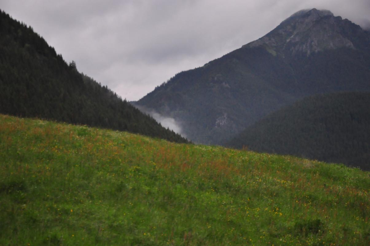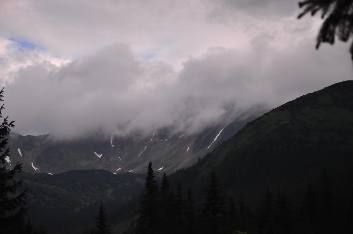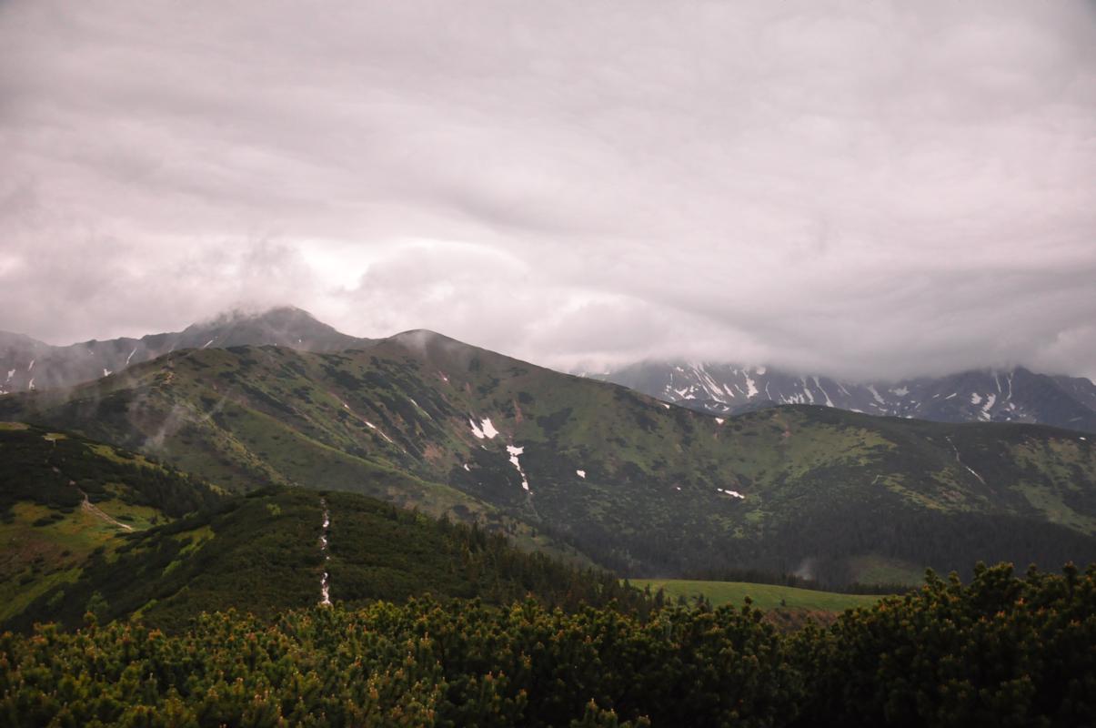 Góry co chwilę wychodzą zza szarych gór, to się chowają. Zaczyna się robić mokro, mży, pada, leje ale idziemy bo w schronisku mamy zarezerwowane trzy noce. Poza tym, jak będzie dalej padać, to przeczekamy i zaplanujemy alternatywnie kolejne dni.