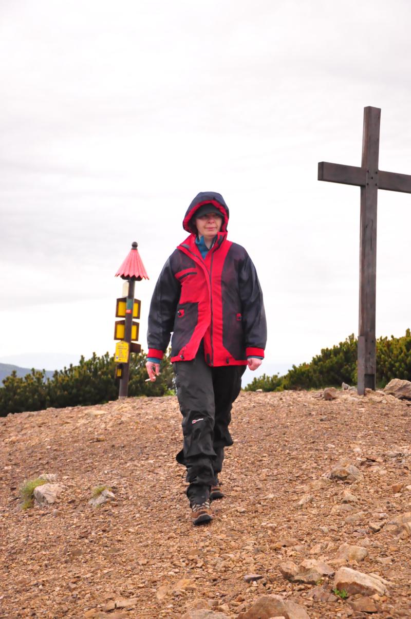Na szczycie pod krzyżem mijamy dwie panie w czarnych sukienkach. Jedna mówi "Szczęść Boże", odpowiadam pani "Dzień Dobry". Komentując coś pod nosem koleżance mija Martę, która udaje, ze podziwia piękno gór i widać, ze nie ma ochoty na wymianę pozdrowień.