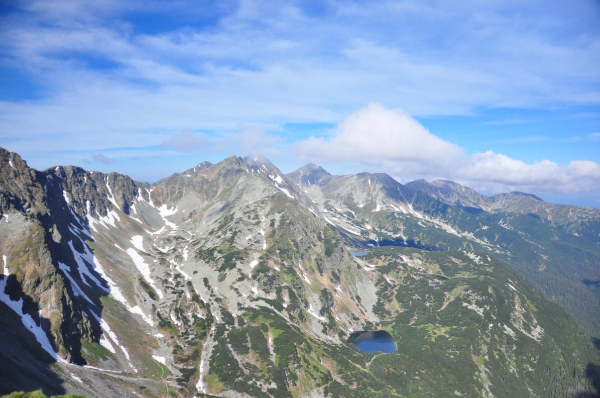 Błękit nieba, białe obłoczki... jesteśmy pierwsi, sami wśród gór. Ciszę przecina tylko wiatr, który pcha nas do przodu, na Rakoń.