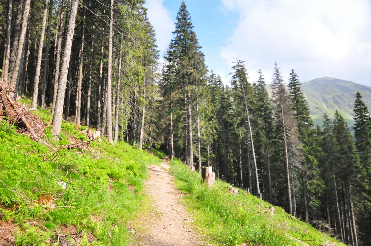Mijając dolinkę, w której widać pasące się krowy przeżuwające soczystą trawę z pachnącej łąki wchodzimy w świerkowy las i idziemy, idziemy i idziemy. Bo idzie się dość długo ale pierwszego dnia zawsze jest to miłe i mało upierdliwe. Po drodze mijamy ludzi, którzy widać, że już wracają z urlopu bo mają mniej rozentuzjazmowane miny niż my.