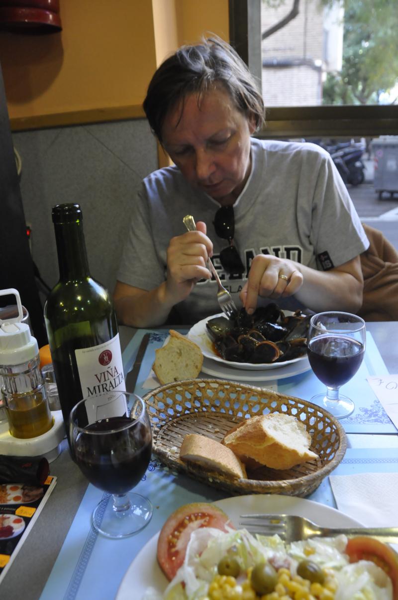 Wczorajszy obiad tak nam smakował, że idziemy pieszo na Barcelonetę. Dziś biorę mule w ostrym sosie jako przystawkę oraz kotlet szwajcarski. Do picia wybieramy wino czerwone półwytrawne, po obiedzie zamiast deseru piję mocną kawę, która tutaj nazywa się kawa solo.