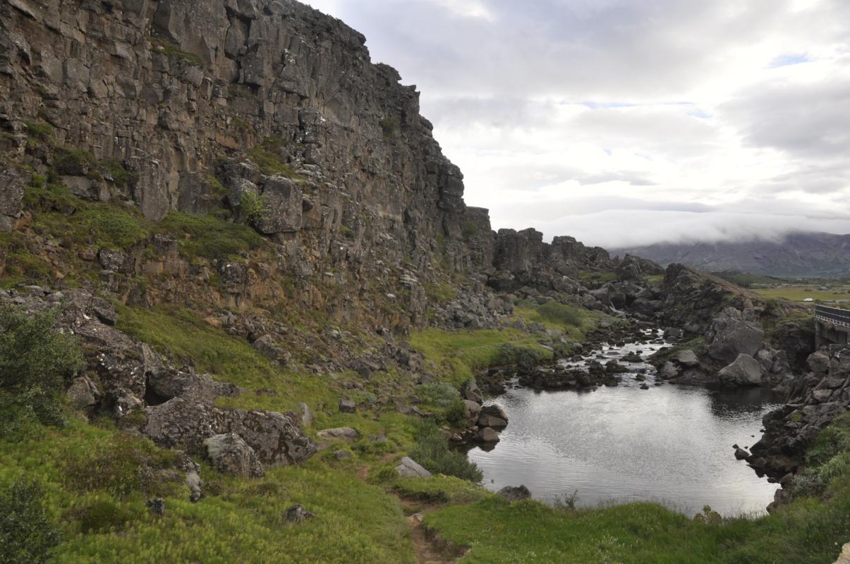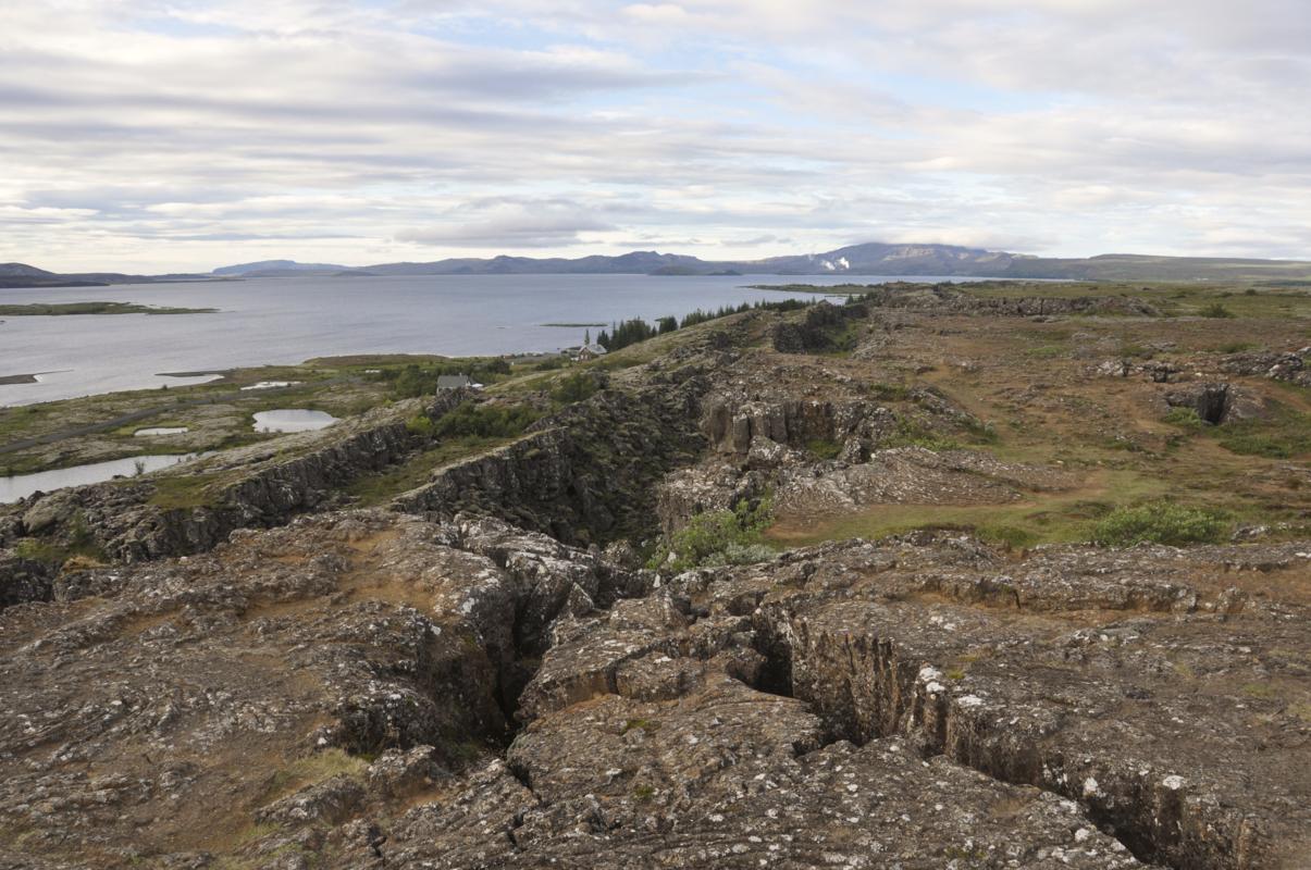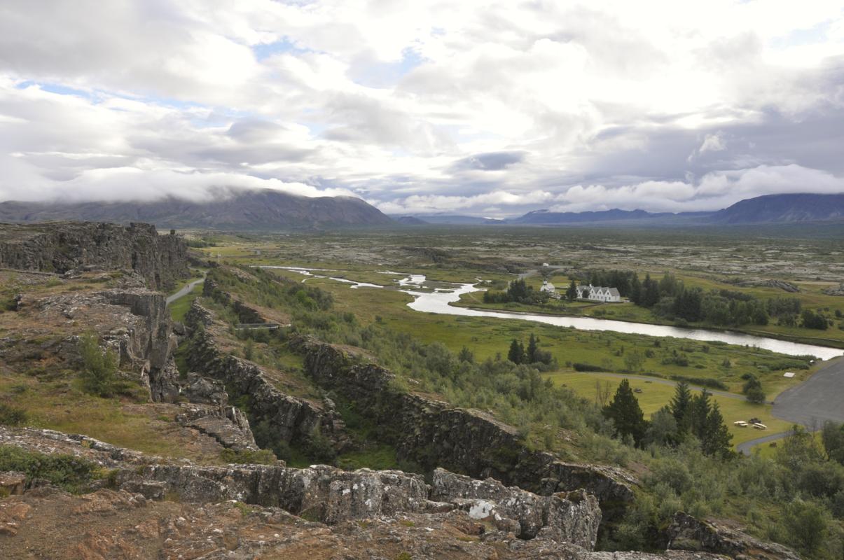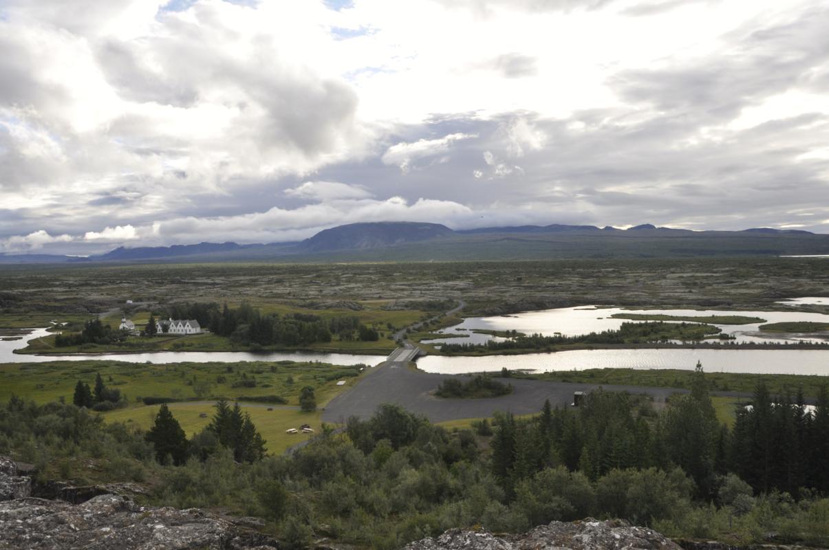 Po niecałej godzince jesteśmy na miejscu. Rozległa równina położona nad jeziorem Tingvallavatn, poprzecinana odnogami jeziora i otoczona z jednej strony murem z zastygłej lawy, robi duże wrażenie. Gdyby, tak jeszcze słoneczko zechciało zaświecić...