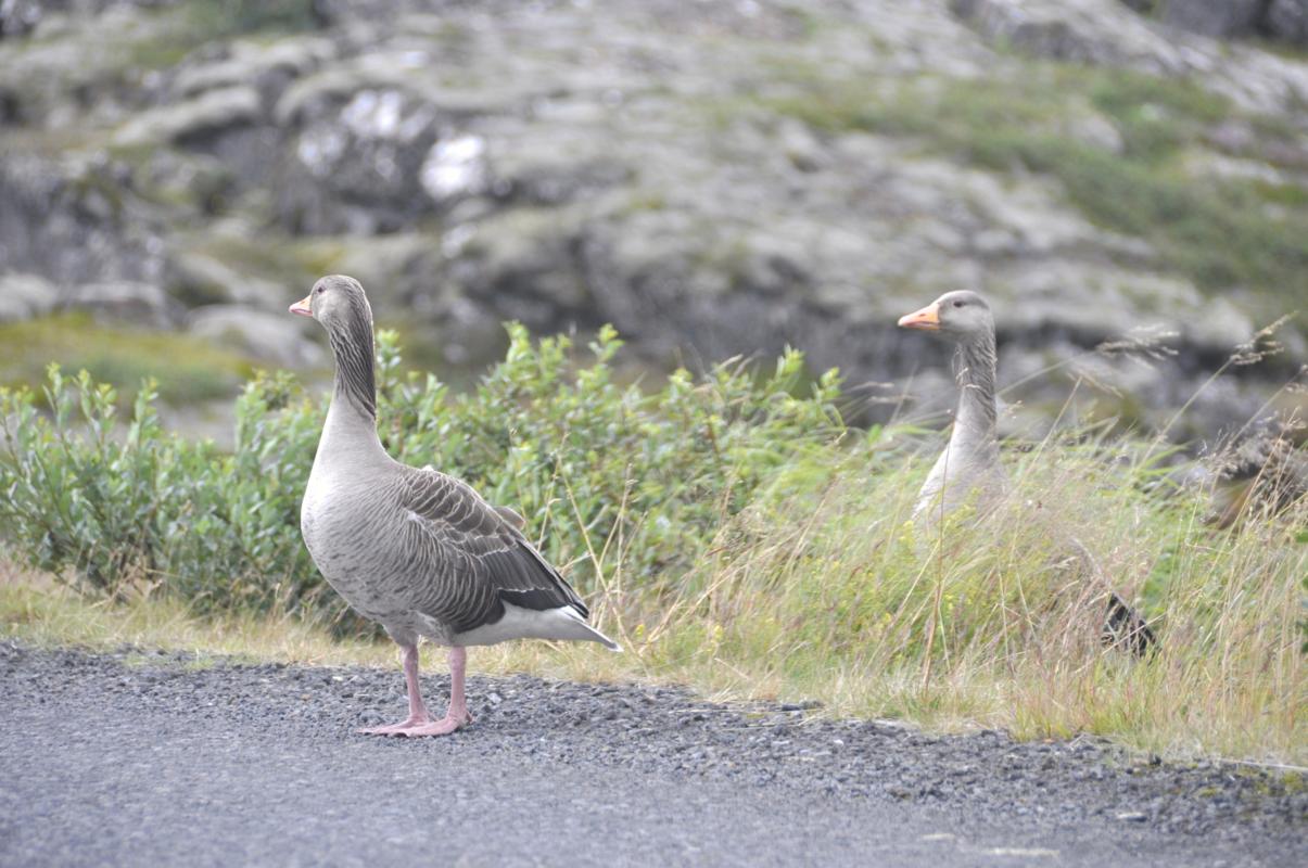 Wracamy do samochodu i jedziemy dalej. Chcę objechać jezioro dookoła, ale drogi nie są zbyt dobre, więc po jakiś 2 kilometrach wracamy. Okolica jest piękna, zresztą, jak i cała Islandia. Dużo gęsi, które łażą po drodze i oczekują, że się je przepuści. Nie widziałem żadnych śladów, aby ktoś taką gąskę upolował samochodem. Widać, że czują się pewnie i bezpiecznie. Z ciekawości zatrzymuję samochód i sprawdzam na jaką odległość mogę podejść. Do około trzech, czterech metrów nie reagują. Kiedy podchodzę bliżej, godnym krokiem oddalają się, zachowując bezpieczny odstęp.