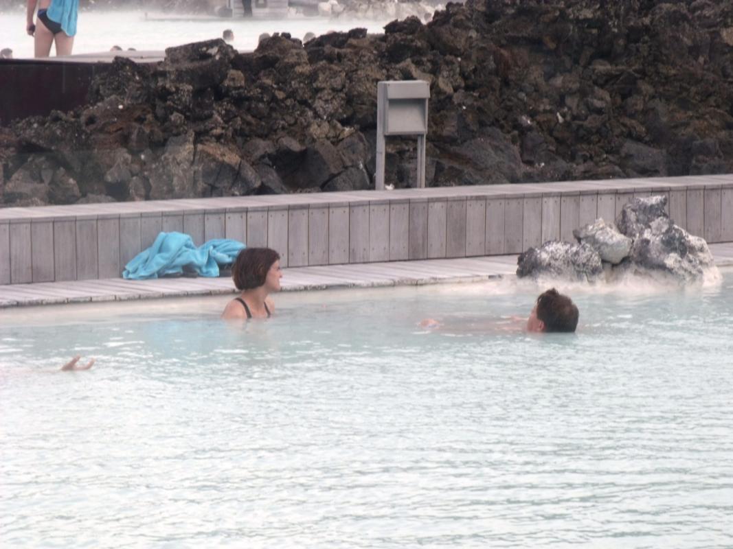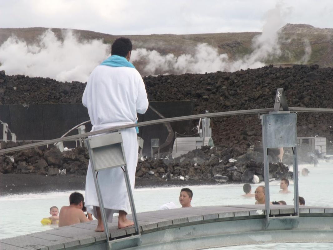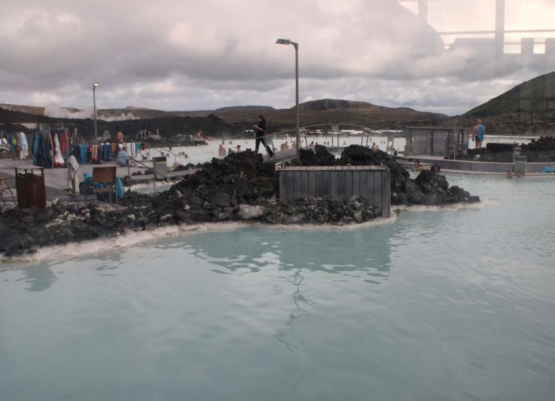 Z moją towarzyszką do kąpieli spotykam się na dole, przed wejściem na teren basenowy. To właściwie, nie basen, tylko jeziorko, a właściwie staw. Islandczycy są ludkiem bardzo zaradnym i pomysłowym. Błękitna Laguna powstała dzięki elektrowni, w której pierwotną, głębinową wodę, o temperaturze ok 240 stopni (to nie pomyłka), po wykorzystaniu spuszcza się do przyszykowanego zbiornika. Same zyski!