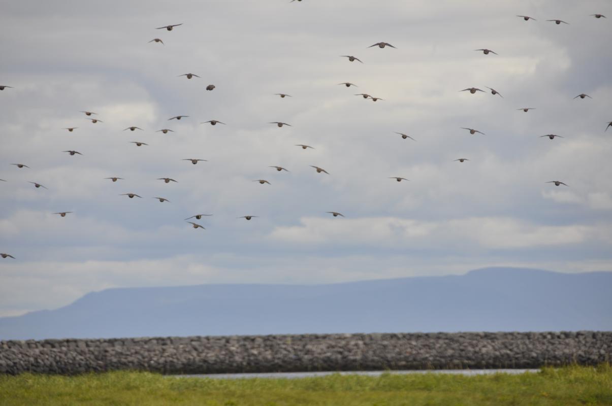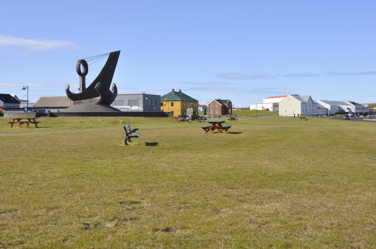 Wreszcie dochodzimy. W tych okolicach, podobno była jedna z pierwszych osad. Stoją domki, które oglądamy z zewnątrz, bo wszystko pozamykane. Domki są typowe dla Islandii. Niskie i kryte darnią. Podobno było w nich ciepło, ale i wilgotno. Reumatyzm pewny!