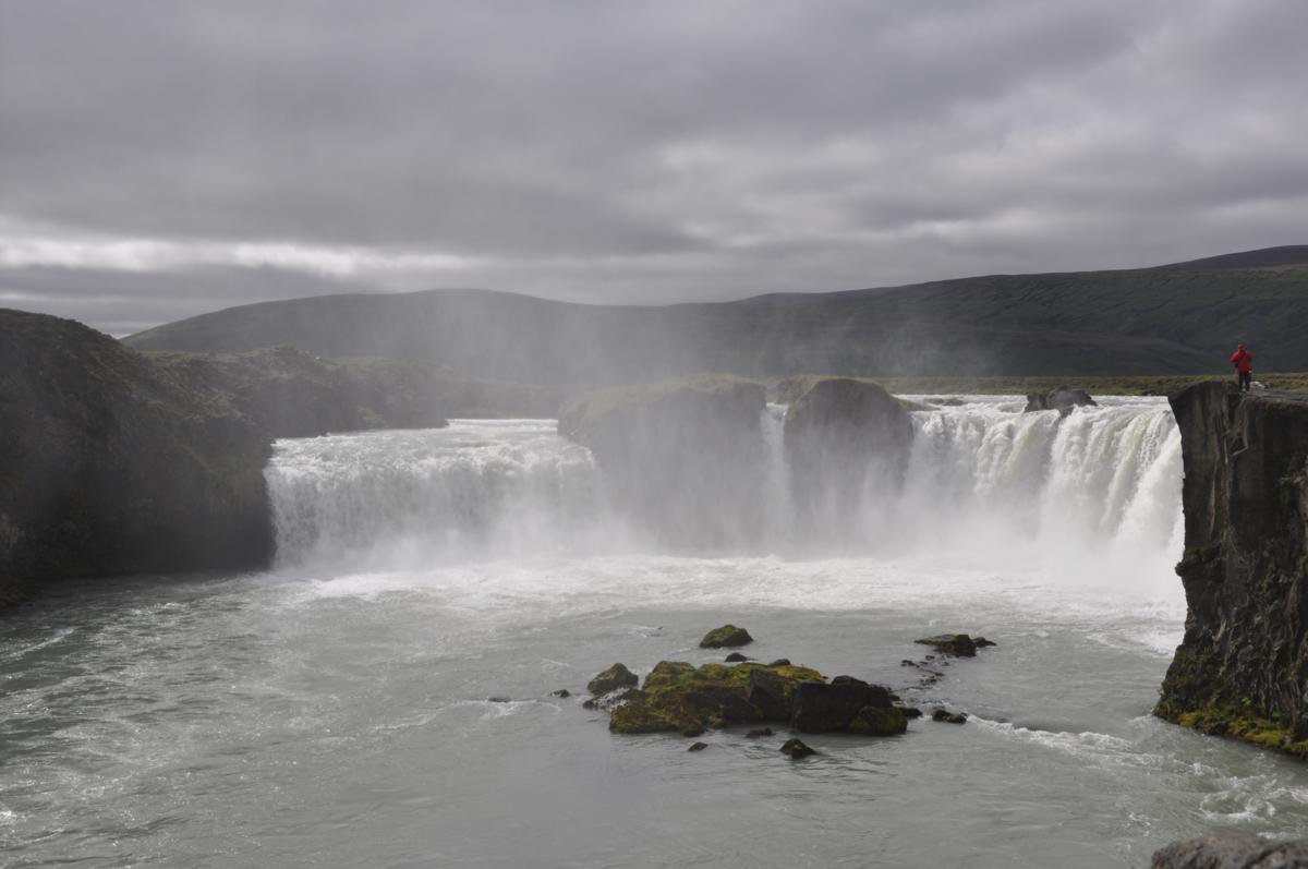 Dojeżdżamy nad Goðafoss. Piękny wodospad w kształcie podkowy. Kiedy jeszcze byliśmy daleko, to myślałem, że są tam gorące źródła, bo widać było, jakby chmurę wyrastającą z ziemi. Jednak, kiedy dojechaliśmy, mogliśmy podziwiać piękno wodospadu. Niestety, nad wodospadem zebrały się chmury i musiałem się zadowolić tym pięknym widokiem z pochmurnym niebem.