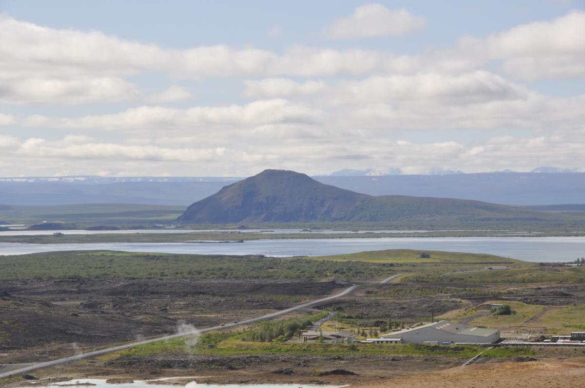 Naszym najbliższym celem jest jezioro Myvatn, gdzie docieramy po godzinnej jeździe. Sporo zwiedzających. Autobusów z wycieczkami i samodzielnych turystów. Parkuję na niewielkim placyku zamienionym w parking, wśród innych pojazdów. Kiedy wysiadamy, dopadają nas meszki. Jest ich niewiele, więc nie widzę problemu. Zapalam papierosa i mając ochronną tarczę idę na wzgórze, skąd roztacza się piękny widok na całe jezioro. Prawdę mówiąc, nie rzuca na nogi. Może na Islandię, to i piękność, może w innej porze roku jest ciekawiej, barwniej...